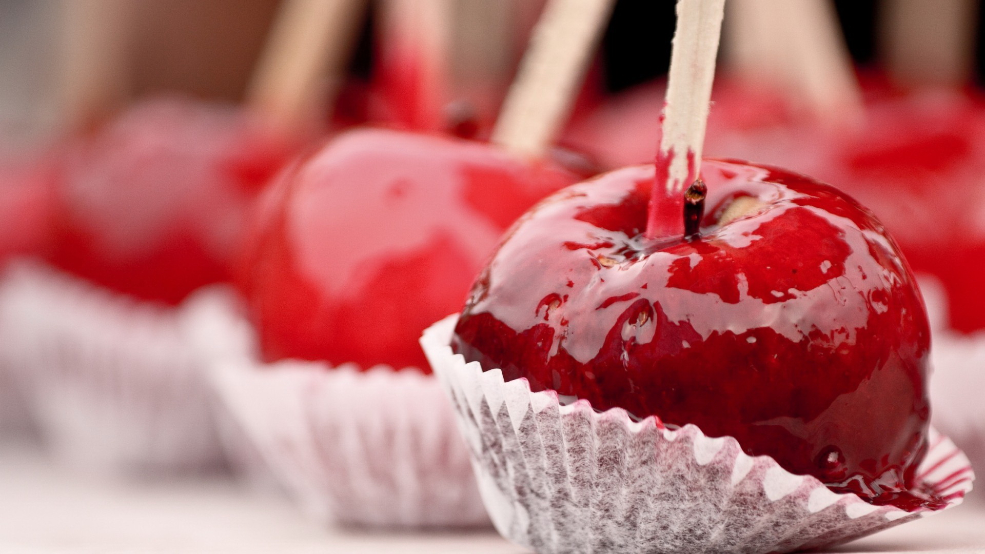 Description: A close up of a red apple with a stick in it's mouth and some other apples in the background.
