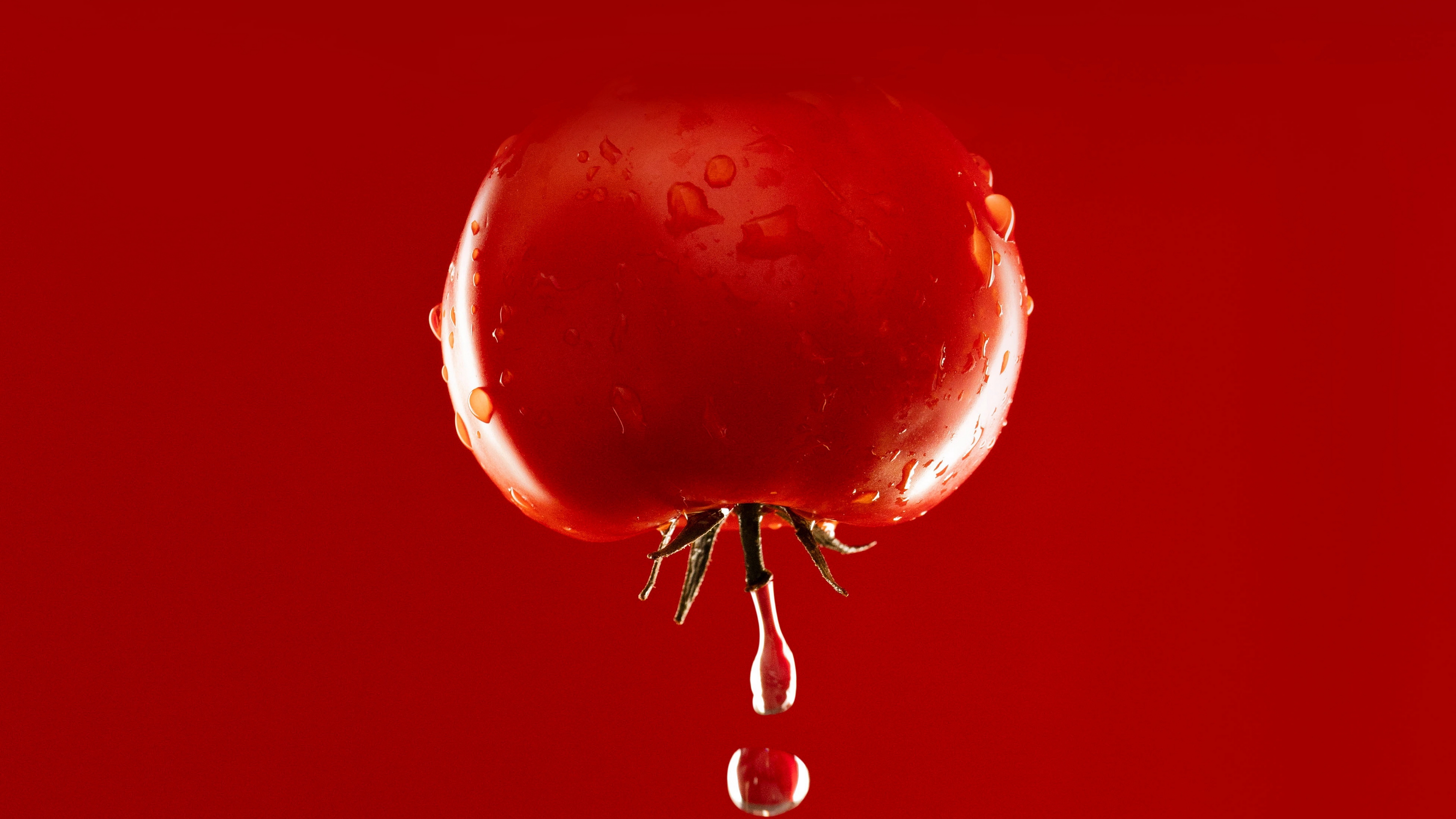 Description: A red apple with water drops hanging from it's side on a red background with a drop of water.