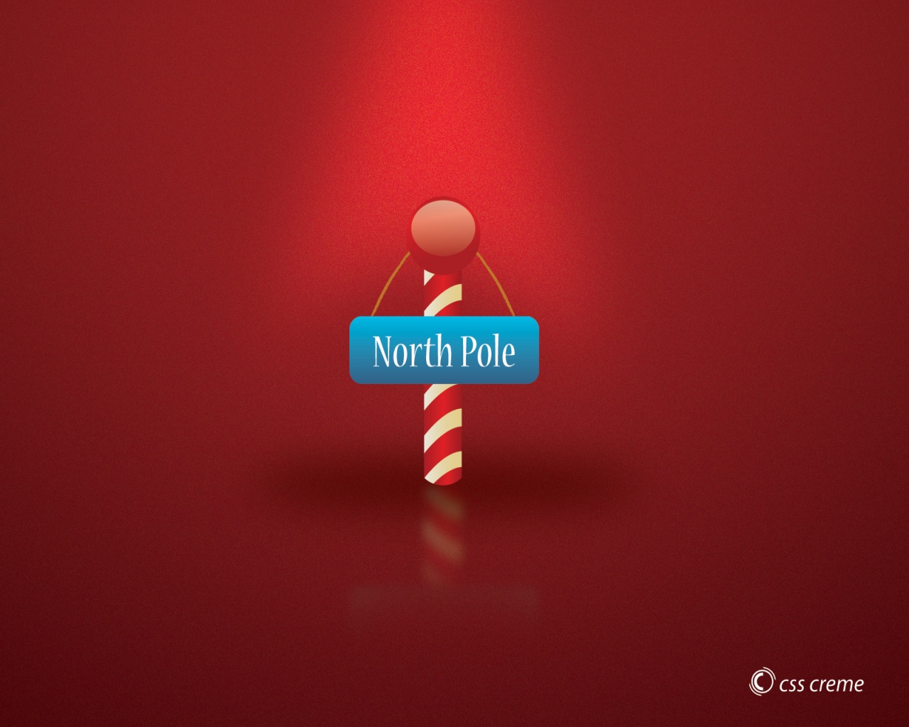 Description: A red background with a blue sign that says north pole on it and a person holding a candy cane.