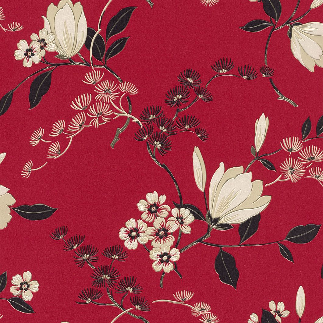 Description: A red background with white and black flowers on it and a black and white flower on the right side of the image.