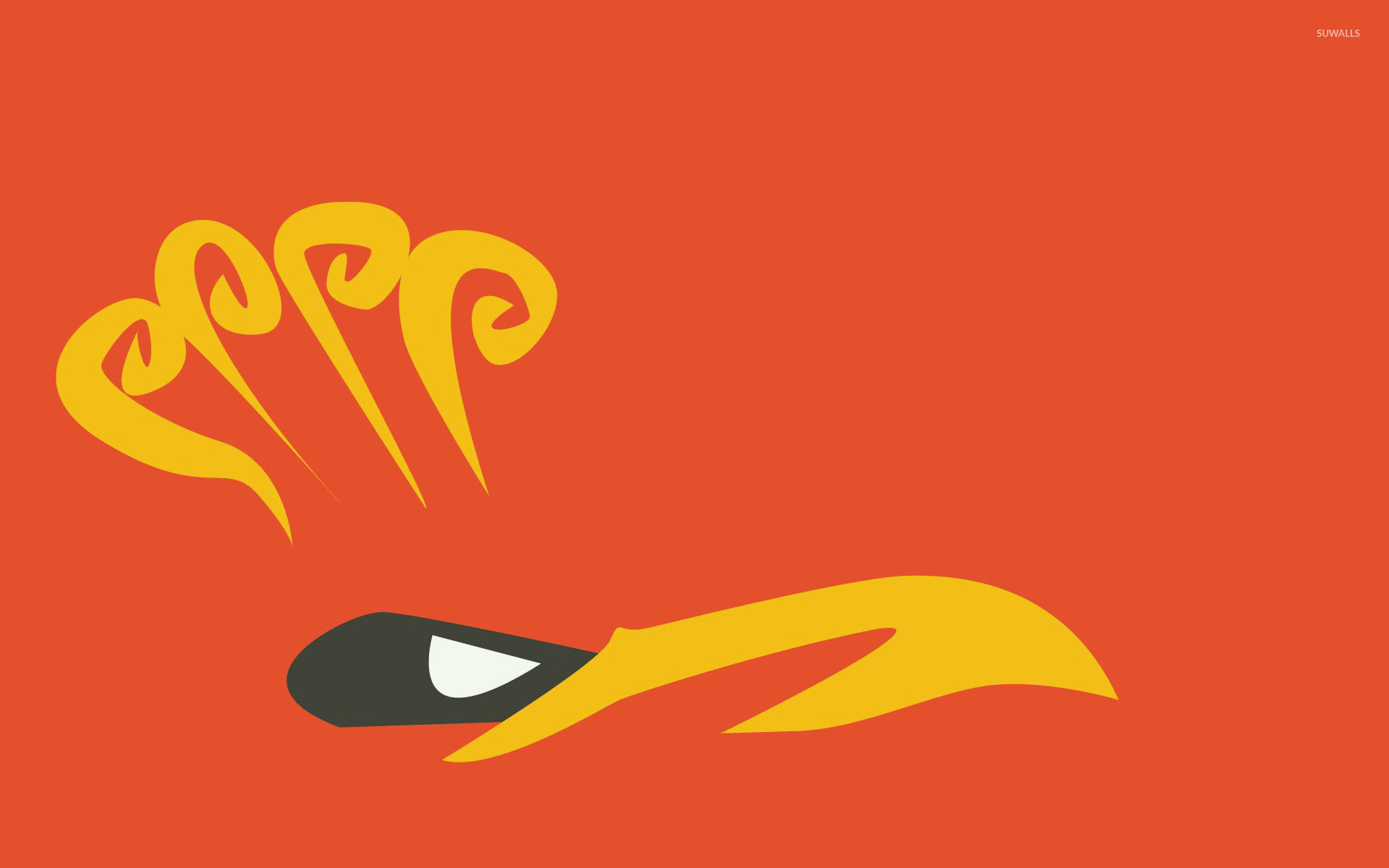 Description: A red background with a yellow bird's head and a black beak with yellow feathers and a red background.