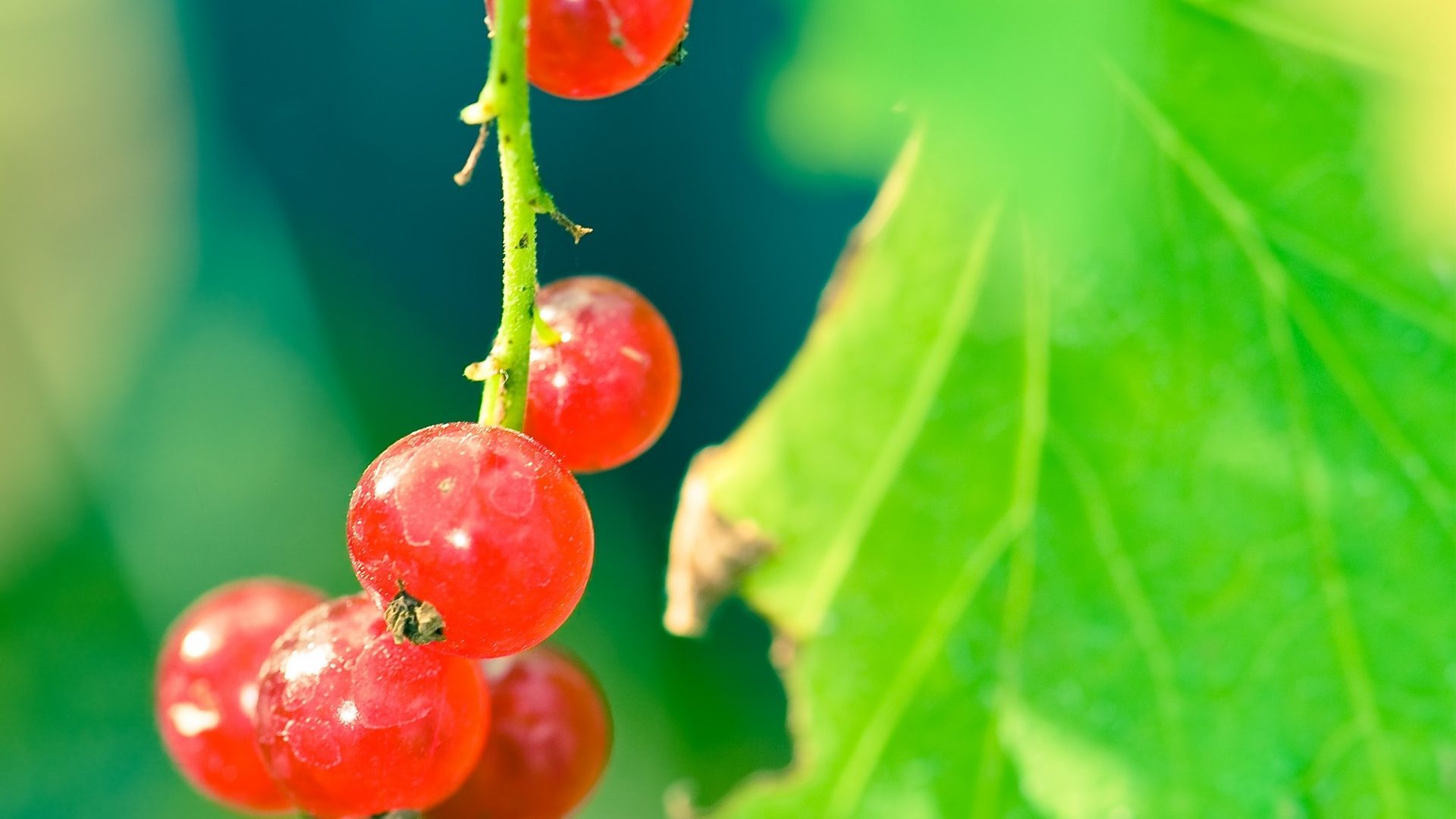 Description: A bunch of red berries hanging from a green leafy branch with water droplets on them.