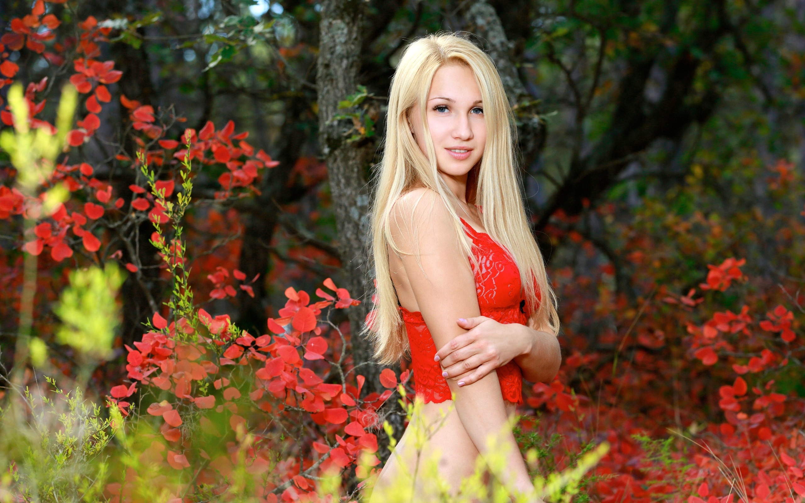 Description: A woman in a red bikini posing in a field of flowers and trees with red flowers in the background.