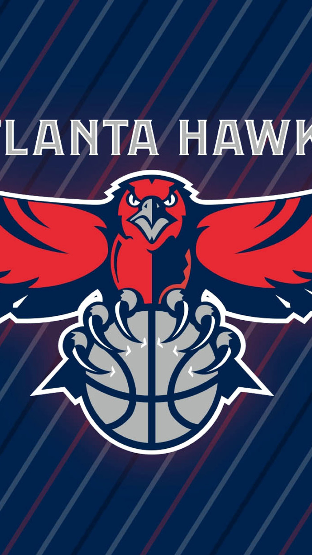 Description: A red bird with a basketball in its beak and the words atlanta hawks on it's chest and a basketball in its beak.
