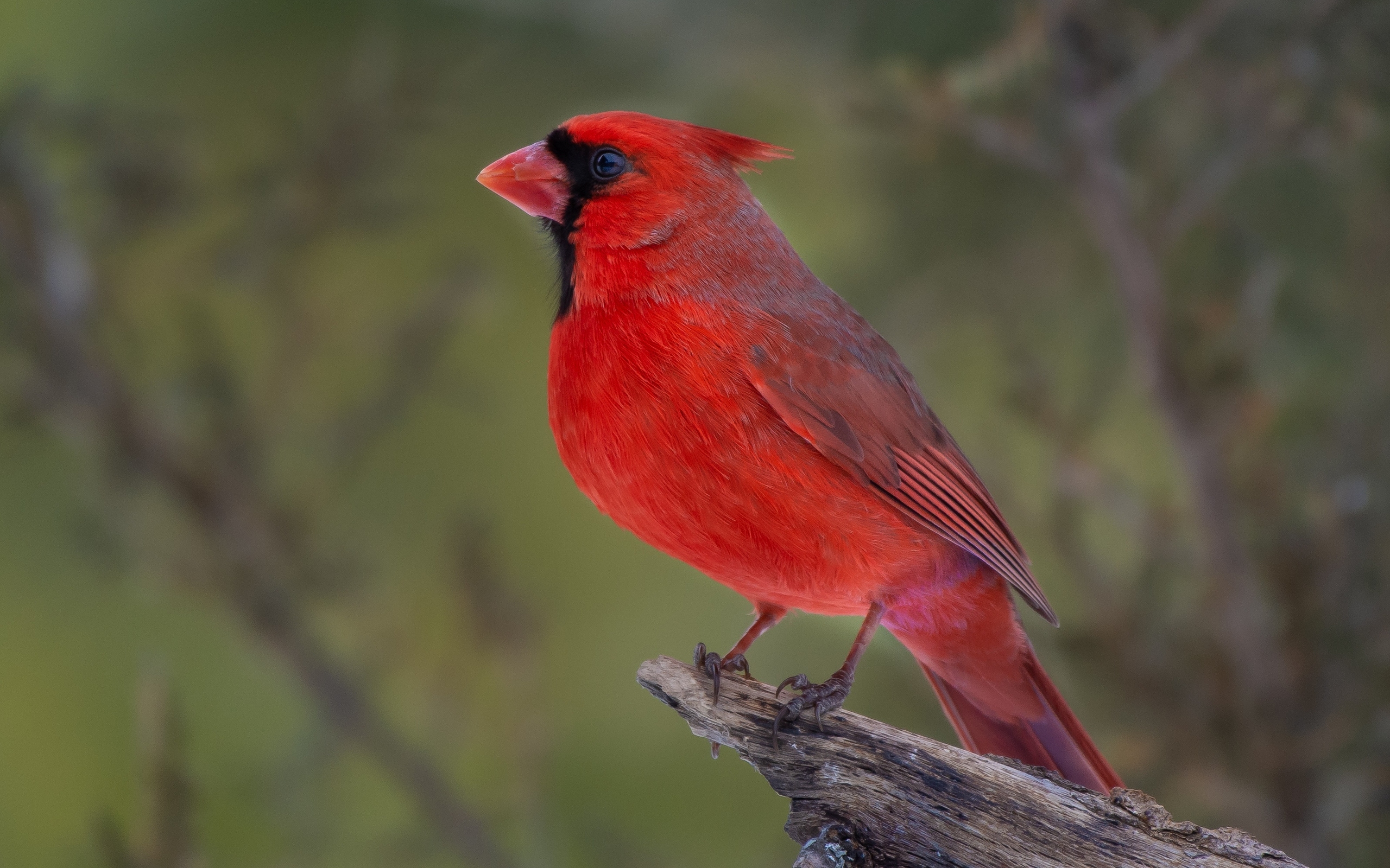 Description: A red bird sitting on a branch in a tree branch with a blurry background of branches and branches.