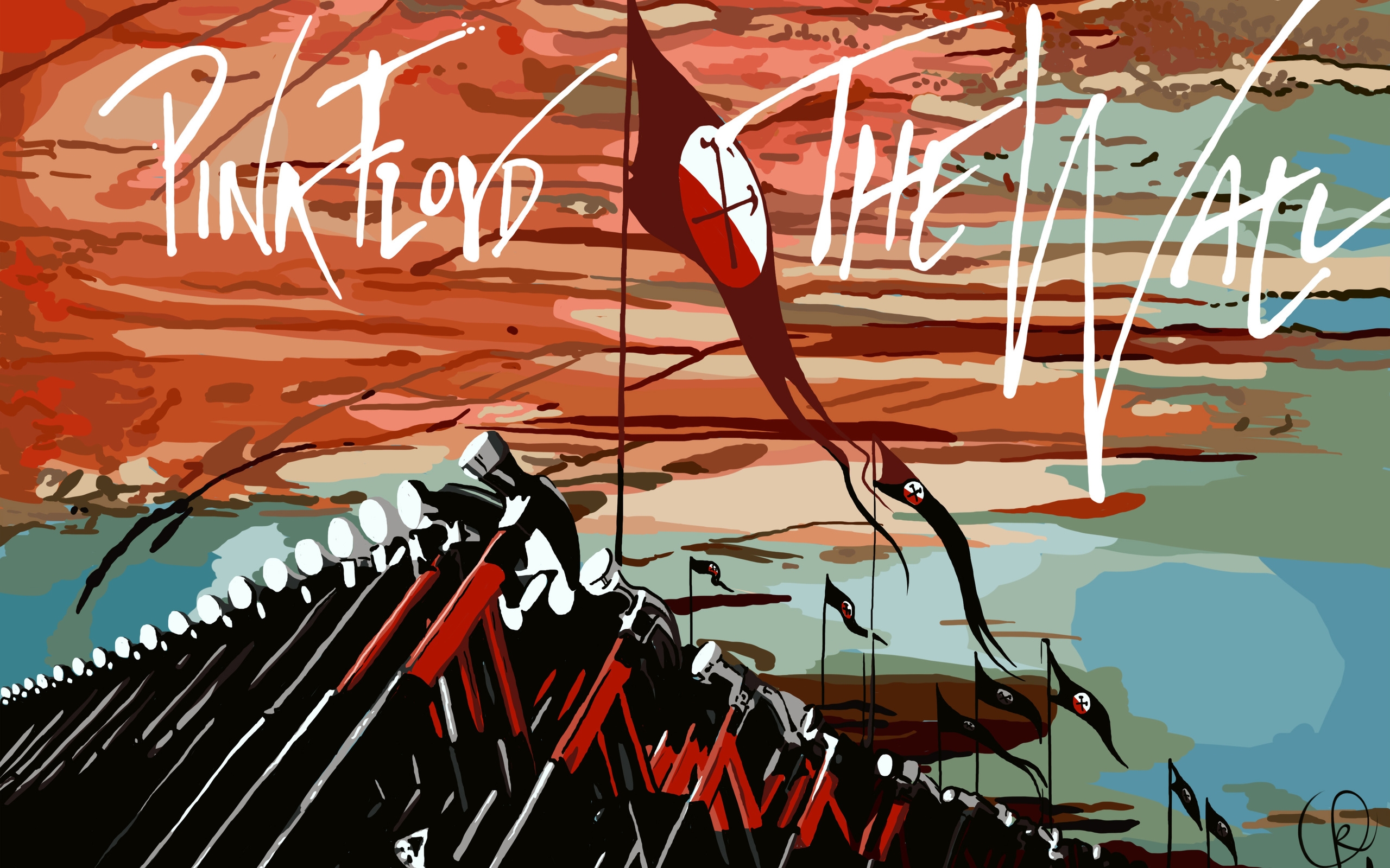 Description: A painting of a red and black boat with the words pink floyd on it's side and a red sky with clouds.