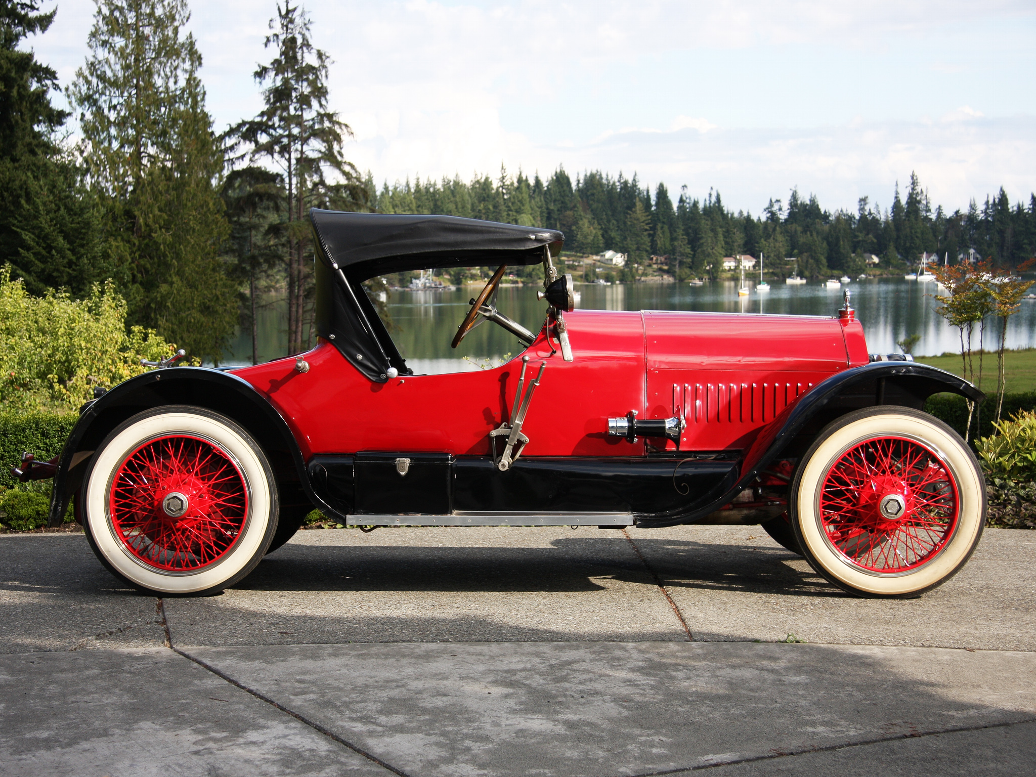Description: A red and black car parked on a street next to a lake and trees in the background with a sky background.