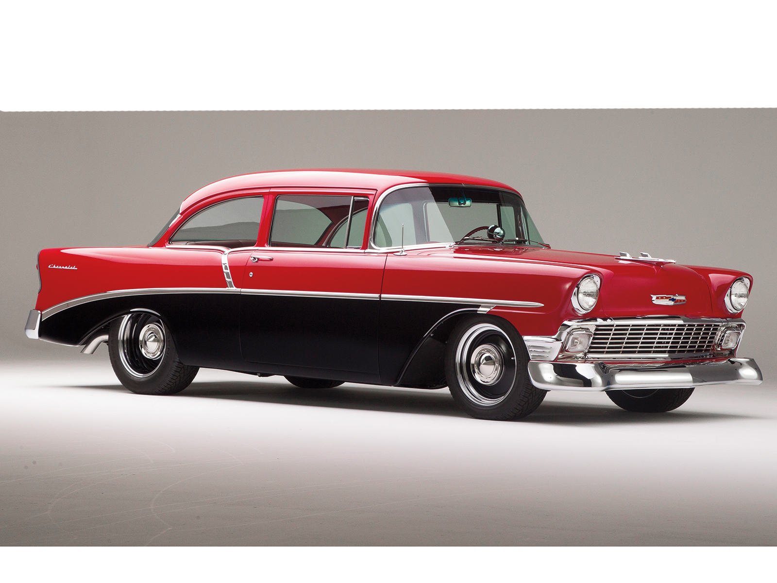 Description: A red and black car is shown in a studio setting with a gray background and a white background behind it.