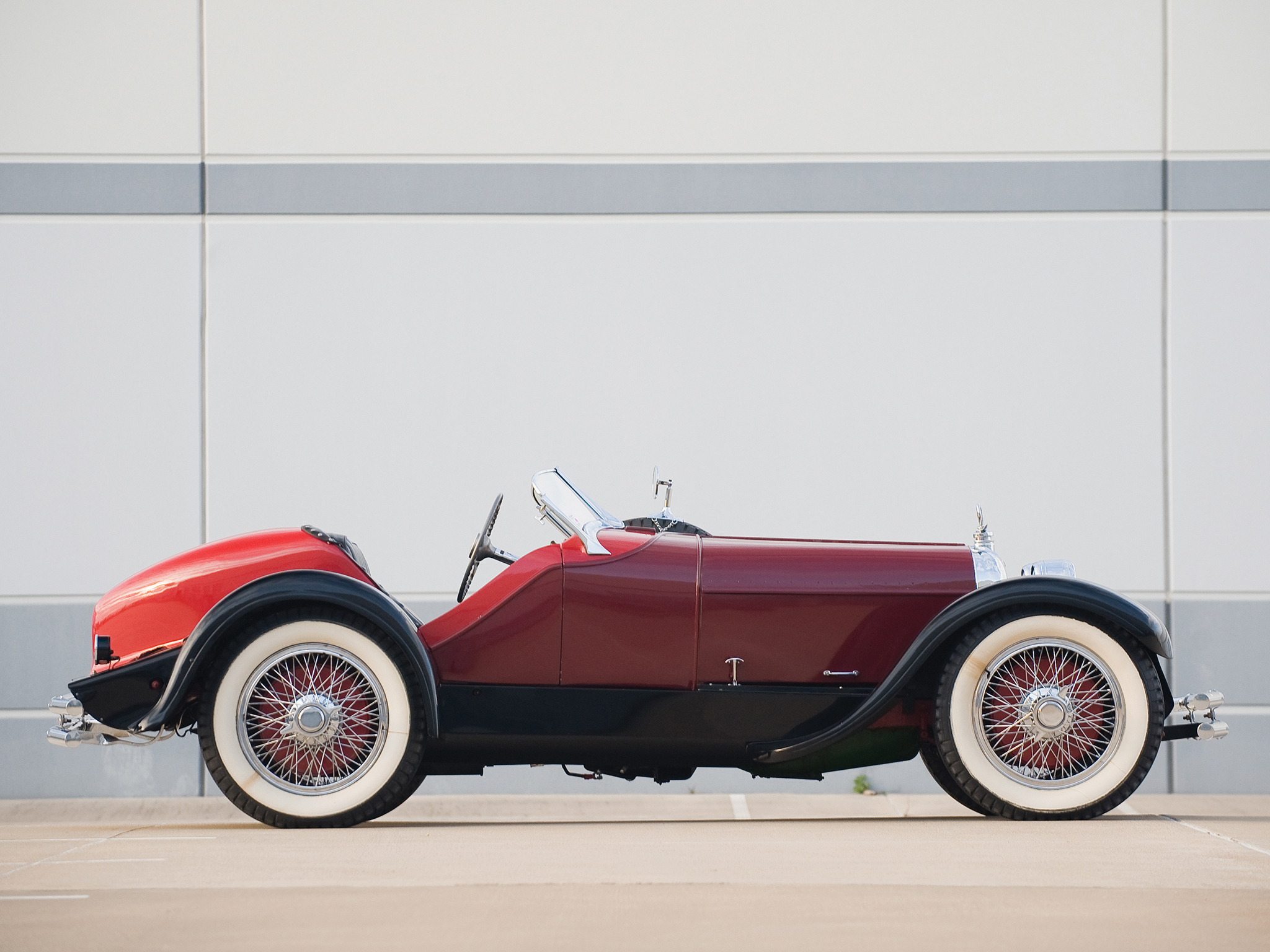 Description: A red and black car parked in front of a building with a white wall behind it and a white door.