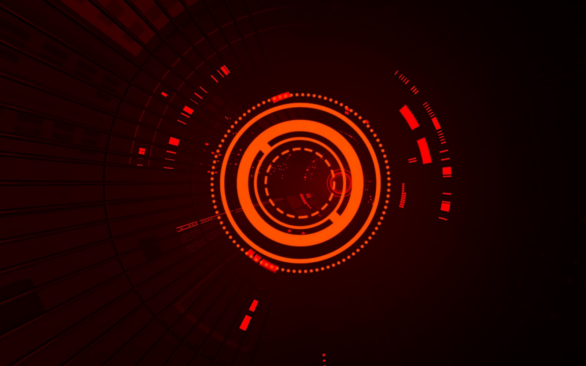 Description: A red and black background with a clock in the center of it and a red light in the middle.