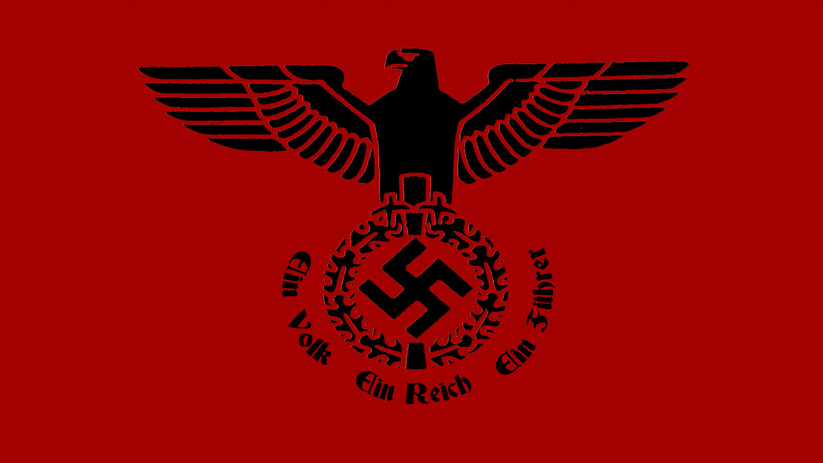 Description: A red background with a black eagle and a red circle with a hammer and sick symbol on it and a black and red background with a red circle with a hammer and a red circle.
