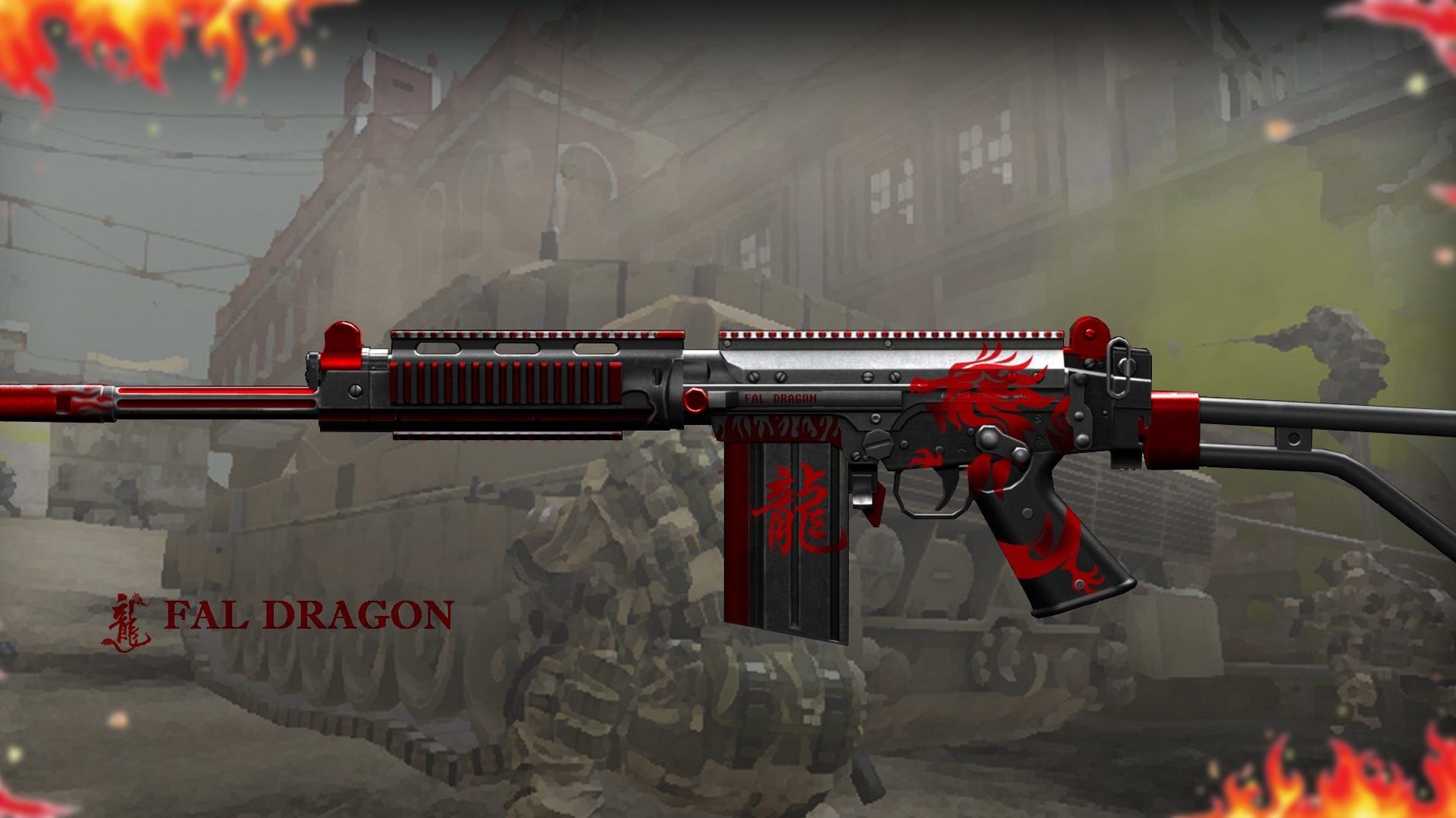 Description: A red and black gun with flames coming out of it's barrel and a red background with a red and black text that reads fall dragon.
