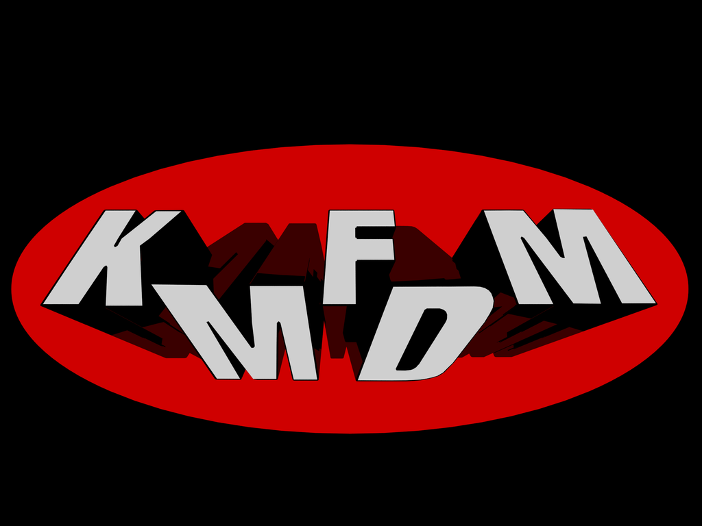Description: A red and black logo with the words kfm on it's side and a black background with a red circle.