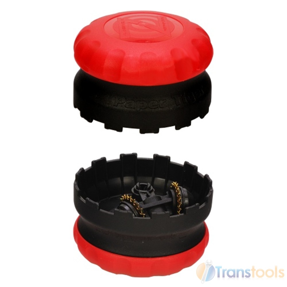 Description: A red and black object with a black base and a red lid on it's side and a black base with a black top.