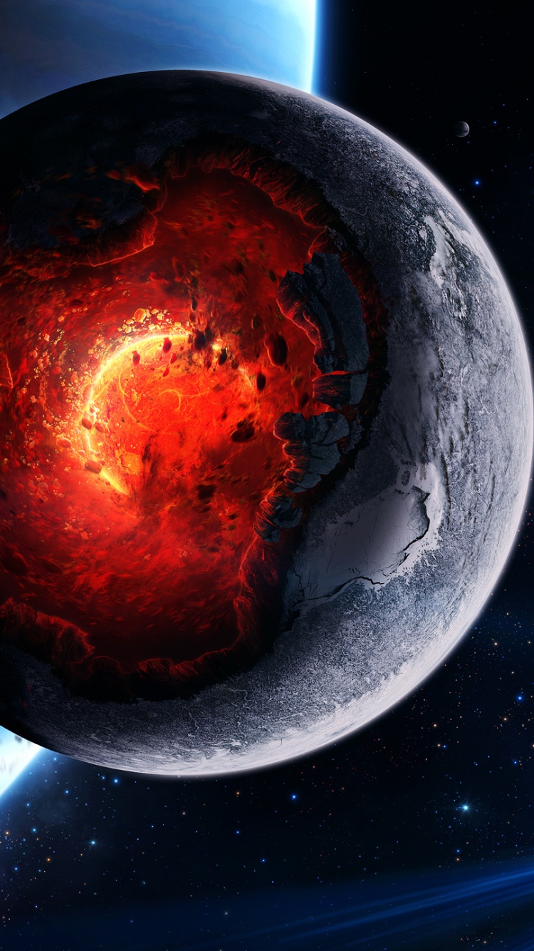 Description: A red and black object in the middle of a space with a blue background and a blue star in the middle.