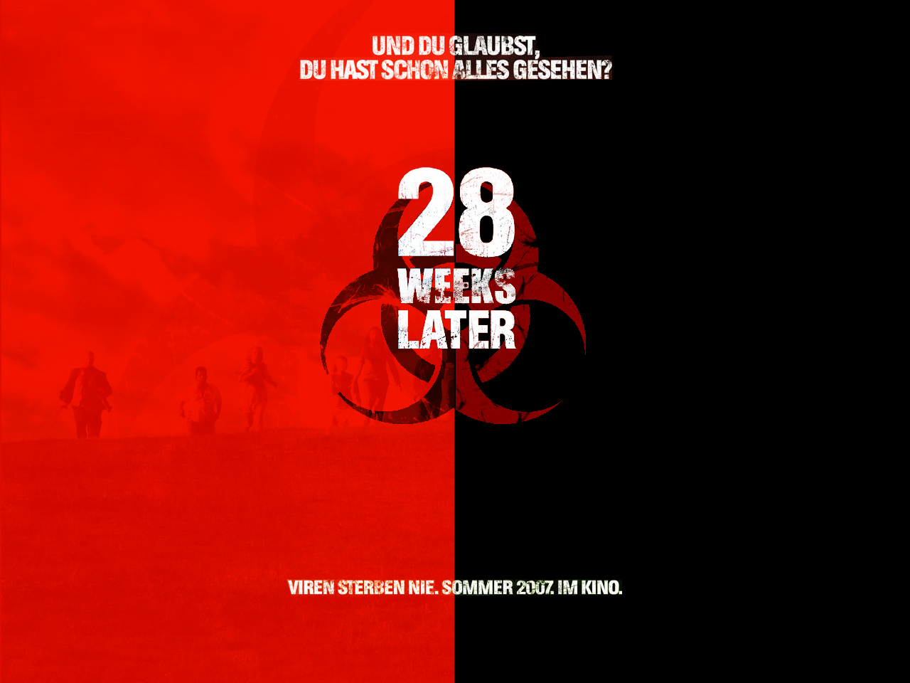 Description: A red and black poster with the words 28 weeks later written in the middle of it and a red and black background.