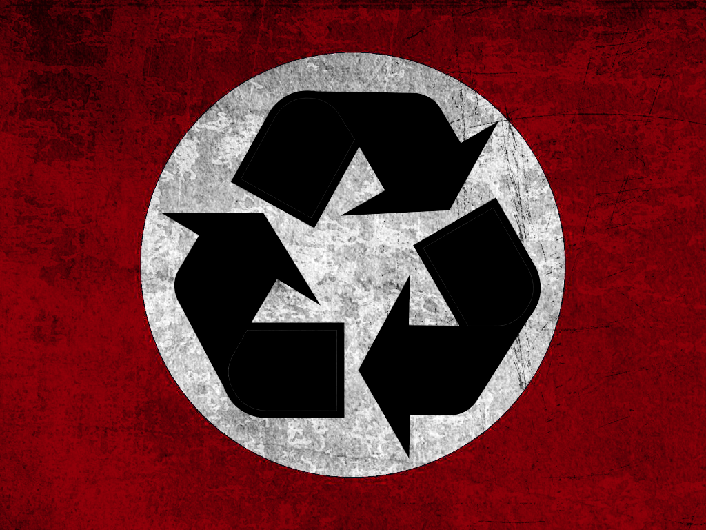 Description: A red and black background with a recycle symbol in the middle of the circle on the bottom.