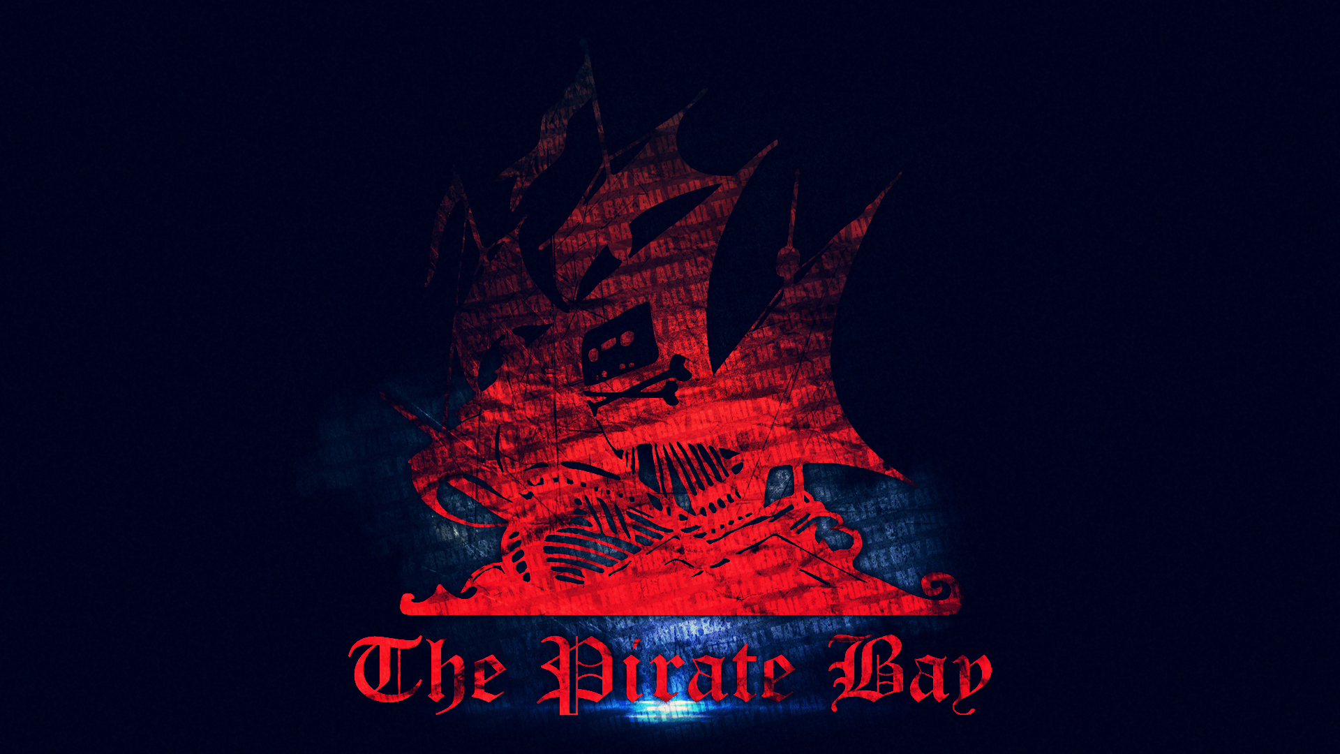 Description: A red and black sign with a pirate ship on it's side in the dark with the words the pirate bay.