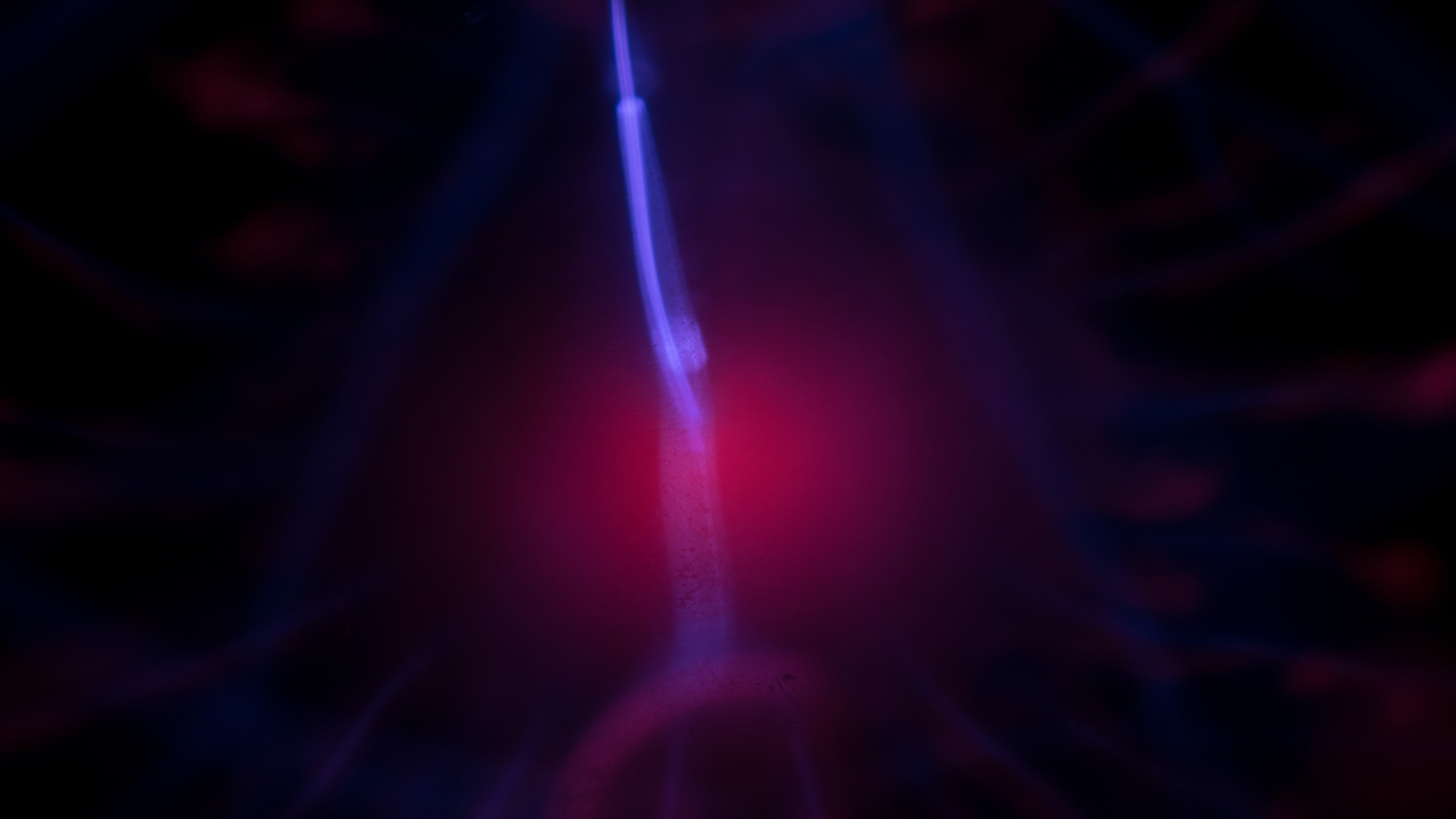 Description: A red and blue light shining through a dark background with a long thin pole in the center of the image.