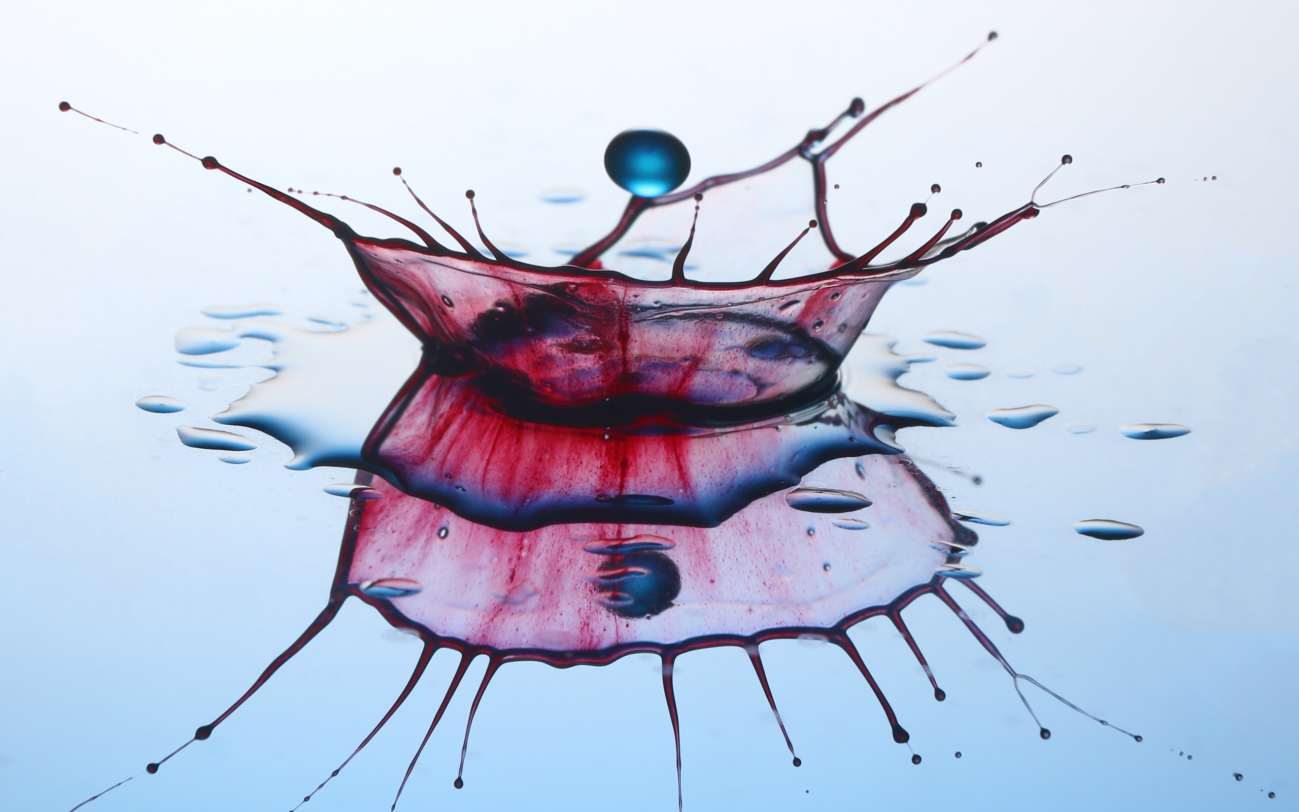 Description: A red and blue liquid splashing into a blue water puddle with drops of water on it and a blue sky background.