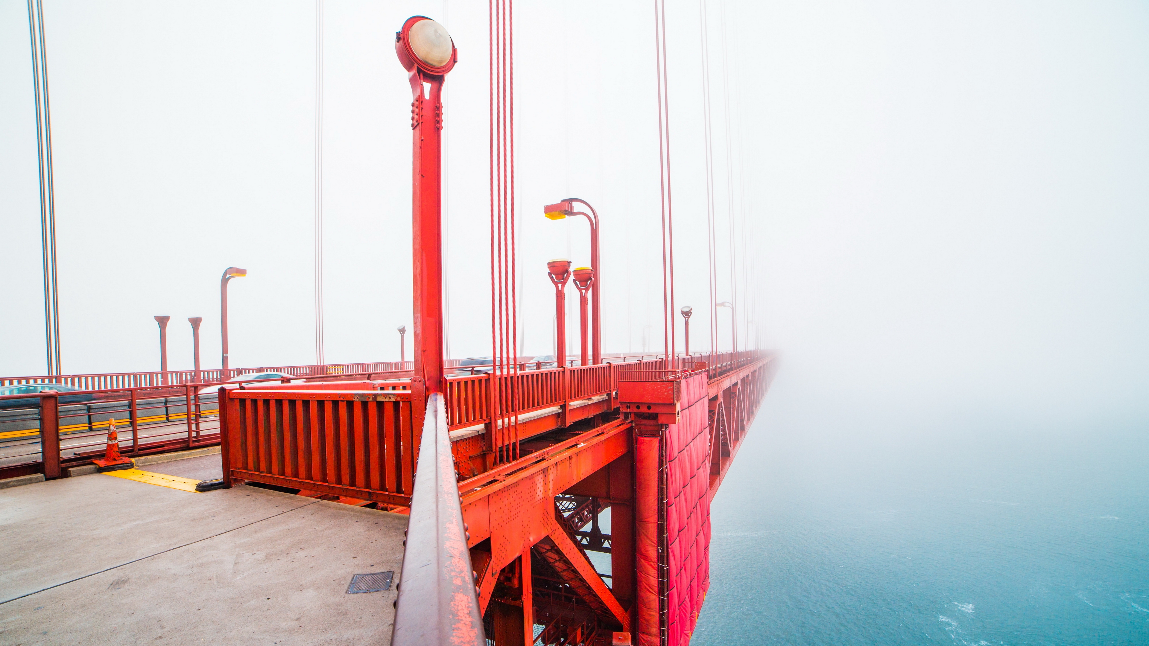 Description: A red bridge with a light on top of it and fog in the air above it and a street light on the side of the bridge.