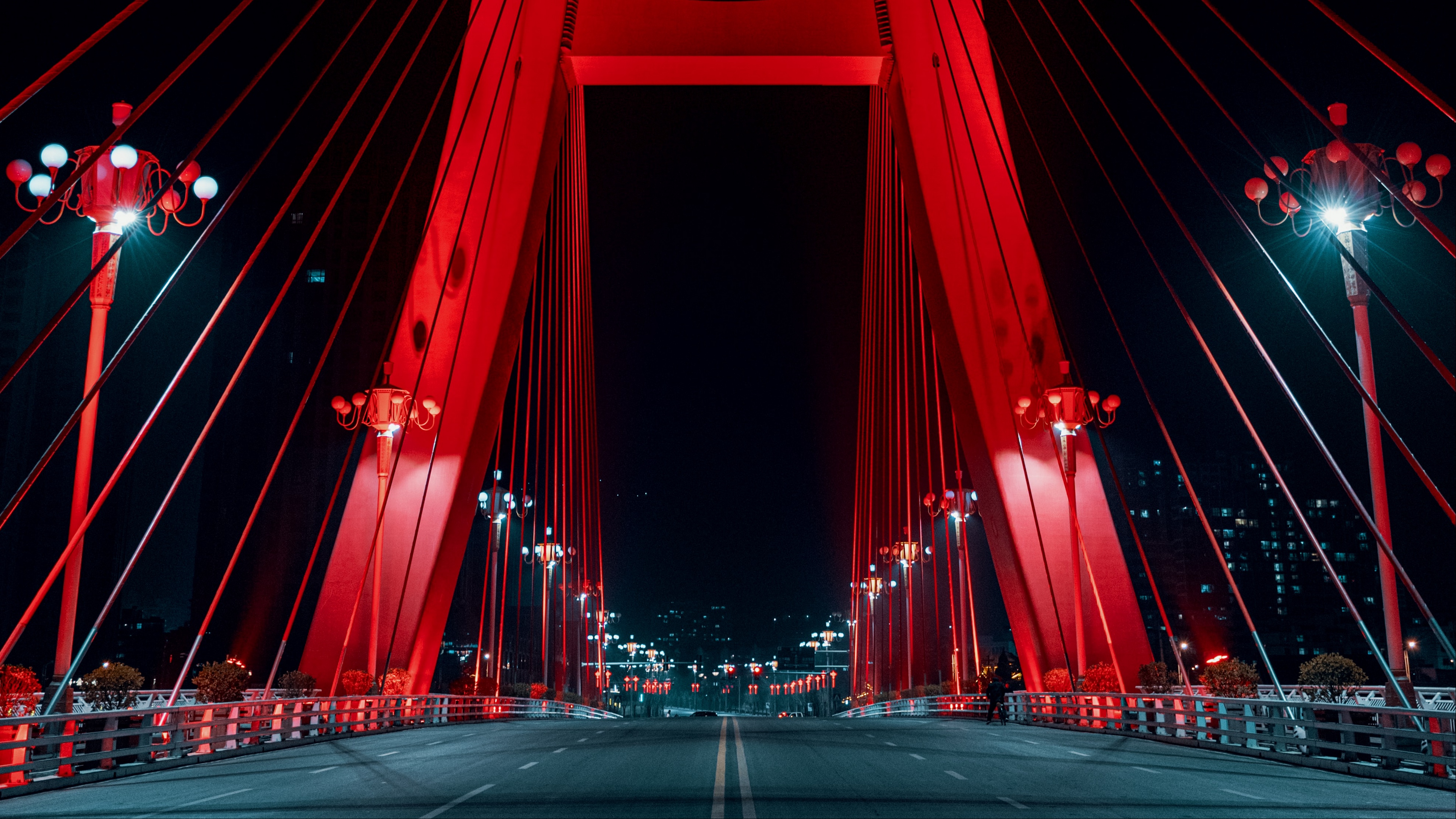 Description: A red bridge with lights on at night time with a city in the background and a street light on the right.
