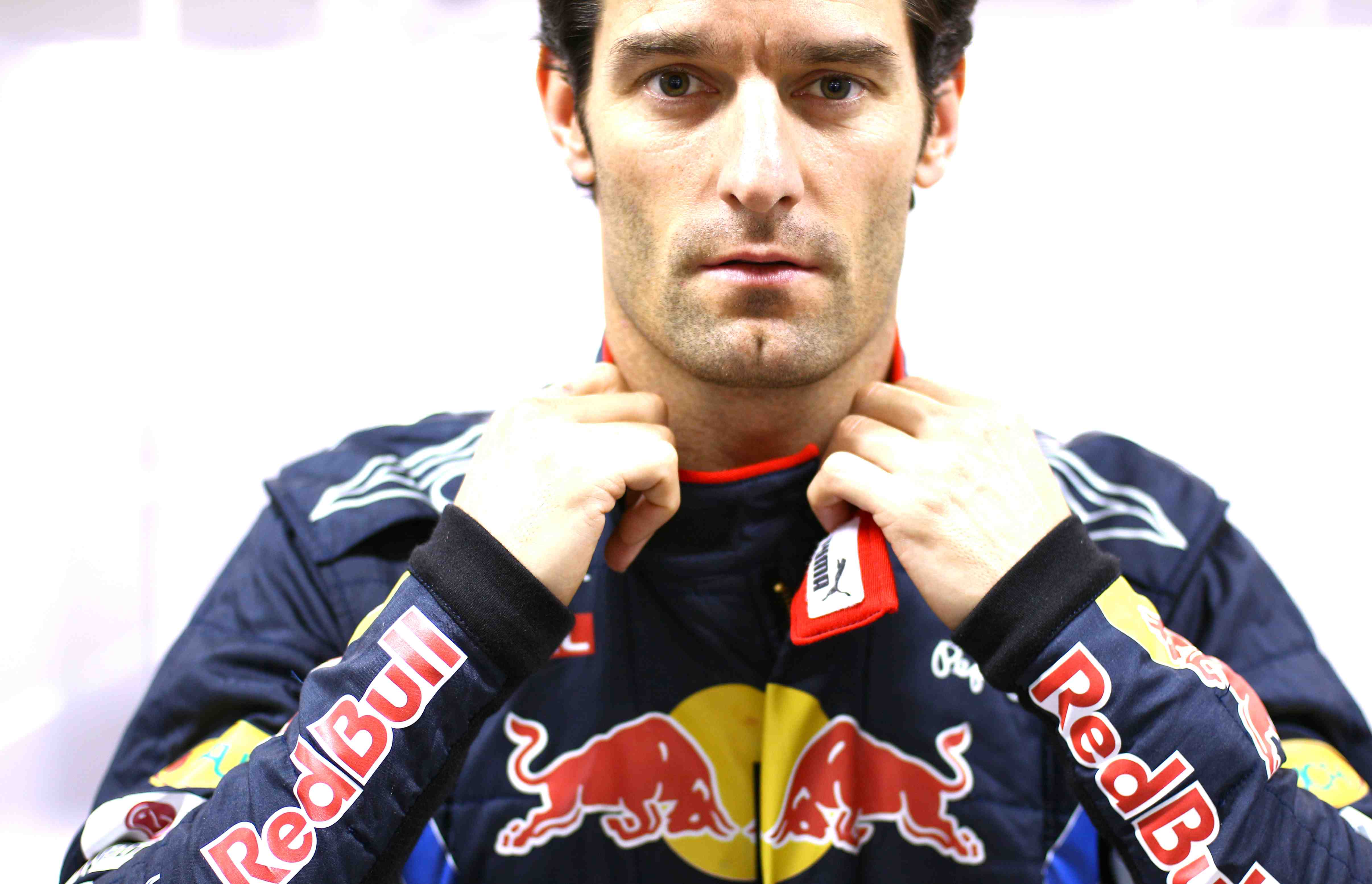 Description: A man in a red bull racing suit is holding his jacket over his shoulder and looking at the camera.