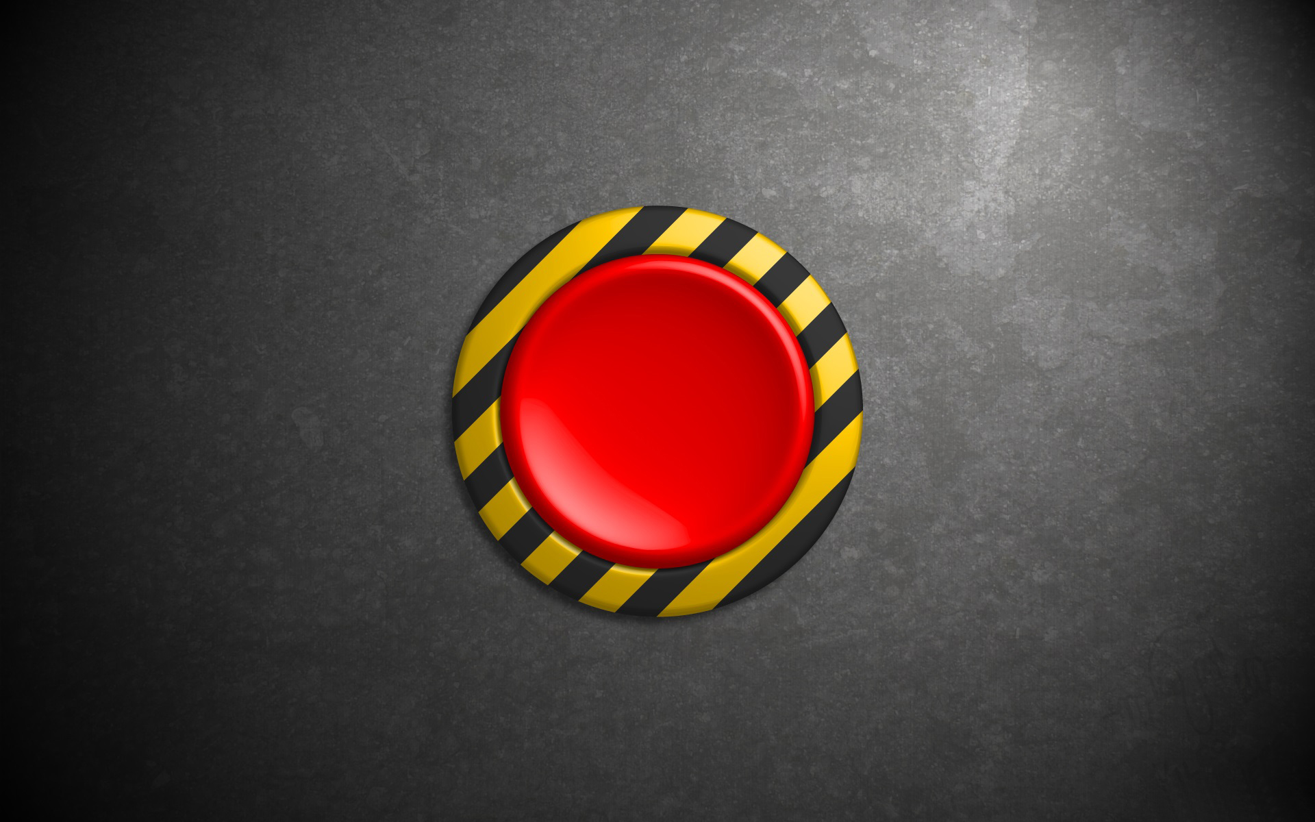Description: A red button with a black and yellow stripe on it on a gray surface with a black background and a light.