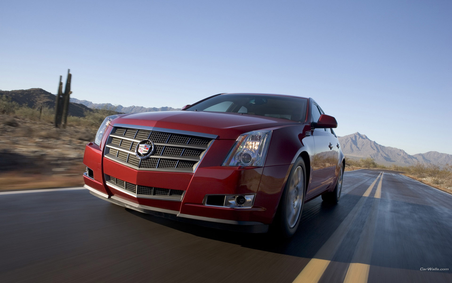 Description: A red cadillac driving down a road in the desert with mountains in the background and a cactus in the foreground.
