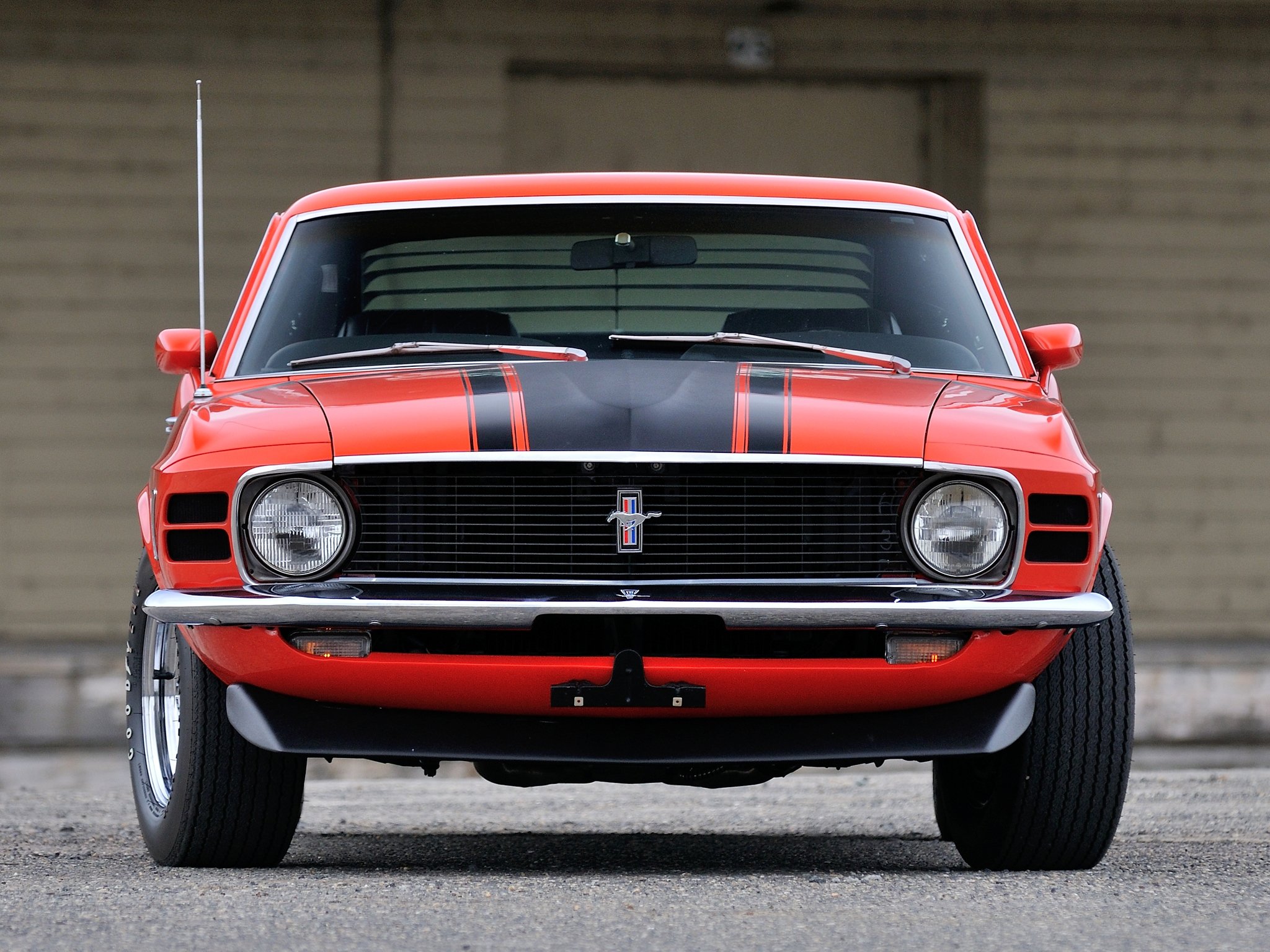 Description: A red car with a black stripe on it's hood and hood scoops is parked in a parking lot.