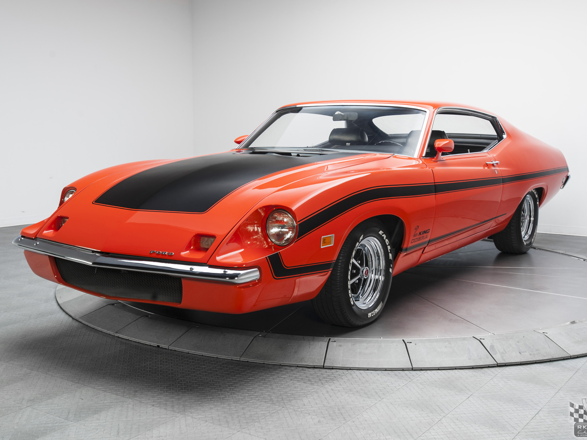 Description: A red car with black stripes on the hood and hood stripes on the hood and hood stripes on the hood.