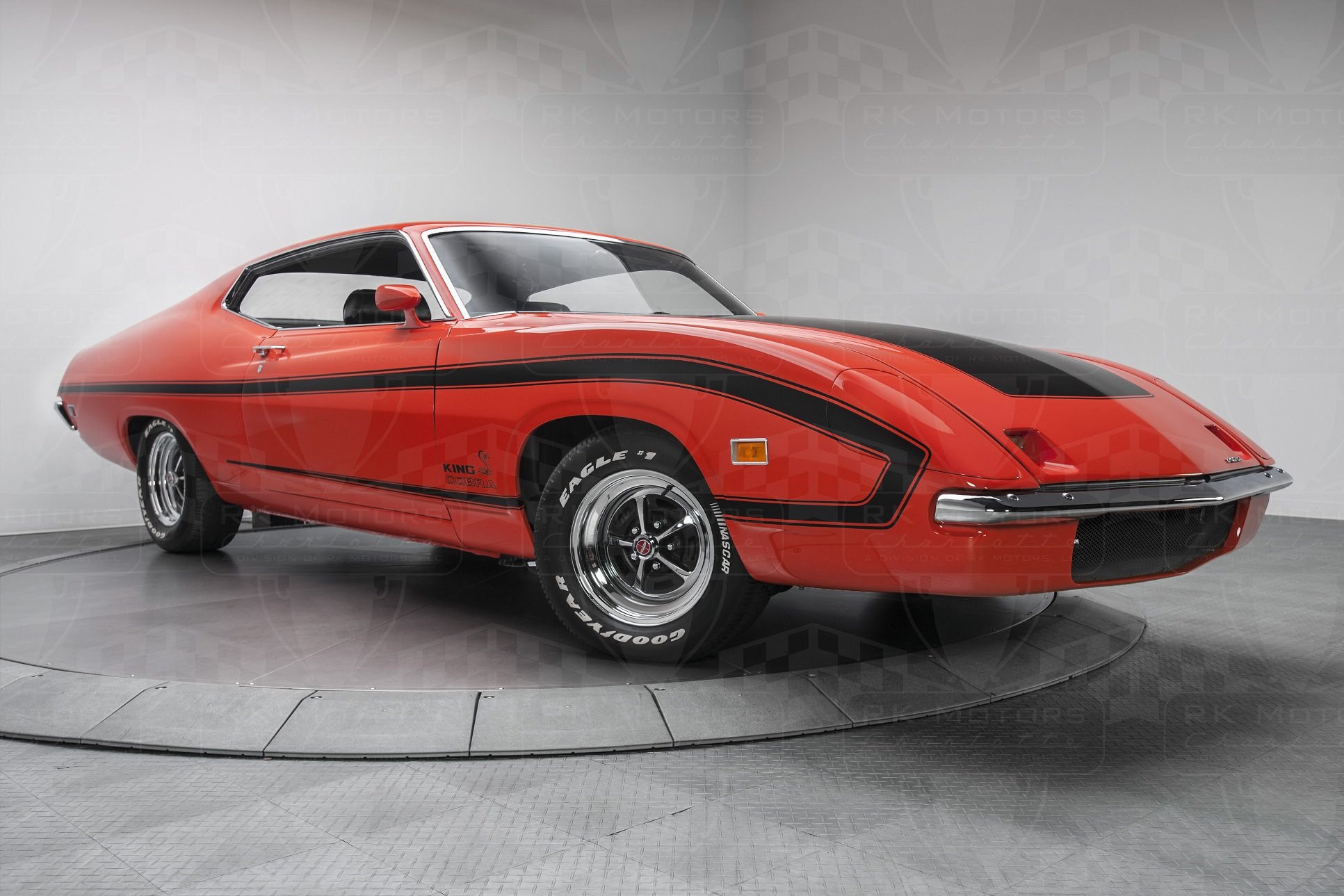 Description: A red car is on a black and white circular surface with a black stripe on the side of the car.