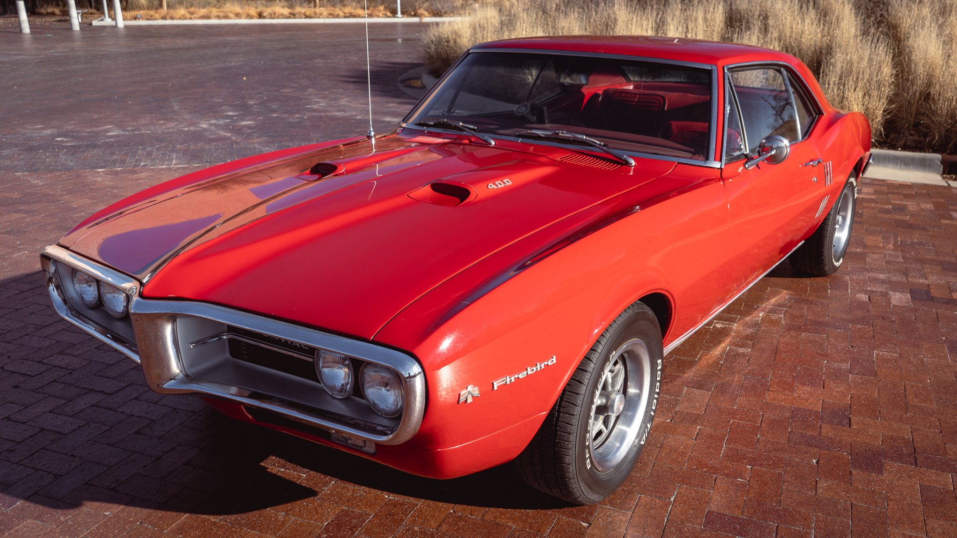 Description: A red car parked on a brick road next to a building and a bush area with tall grass and a red brick sidewalk.
