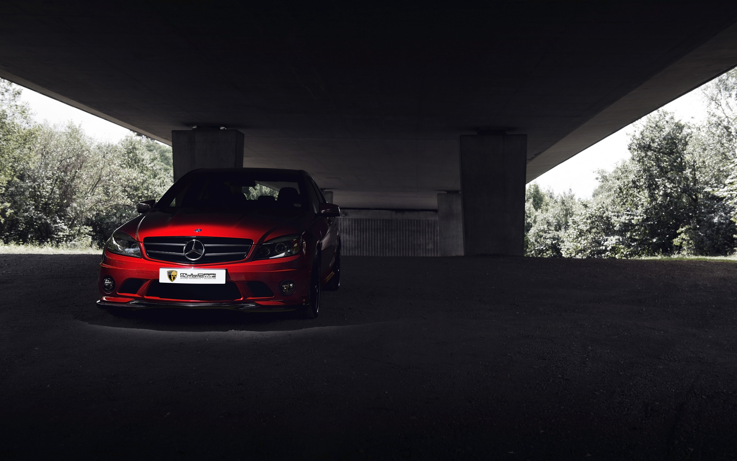 Description: A red car parked under a bridge in the dark with trees in the background and a light at the end of the tunnel.