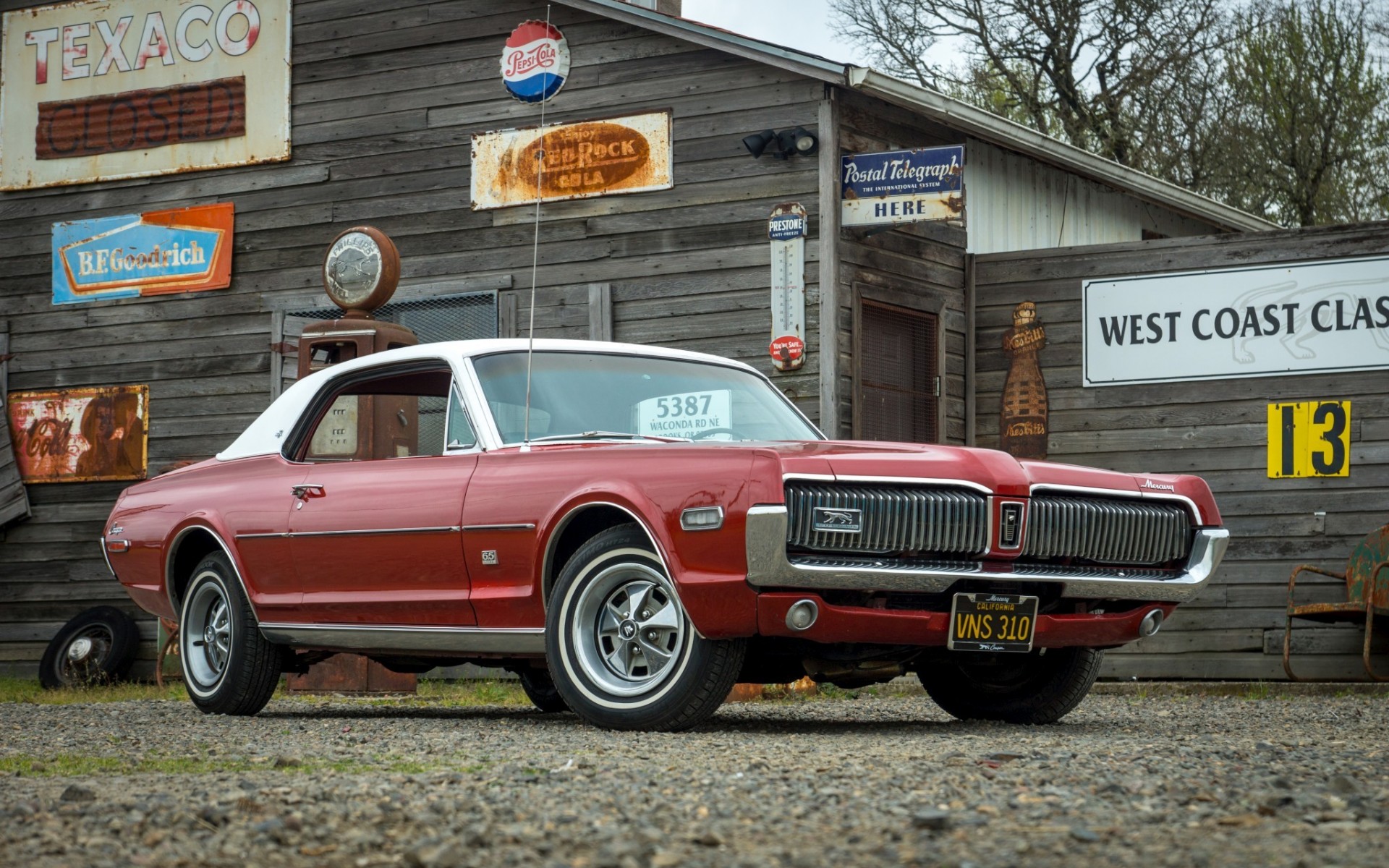 Description: A red car parked in front of a building with a sign on it's side and a sign for a west coast classic.