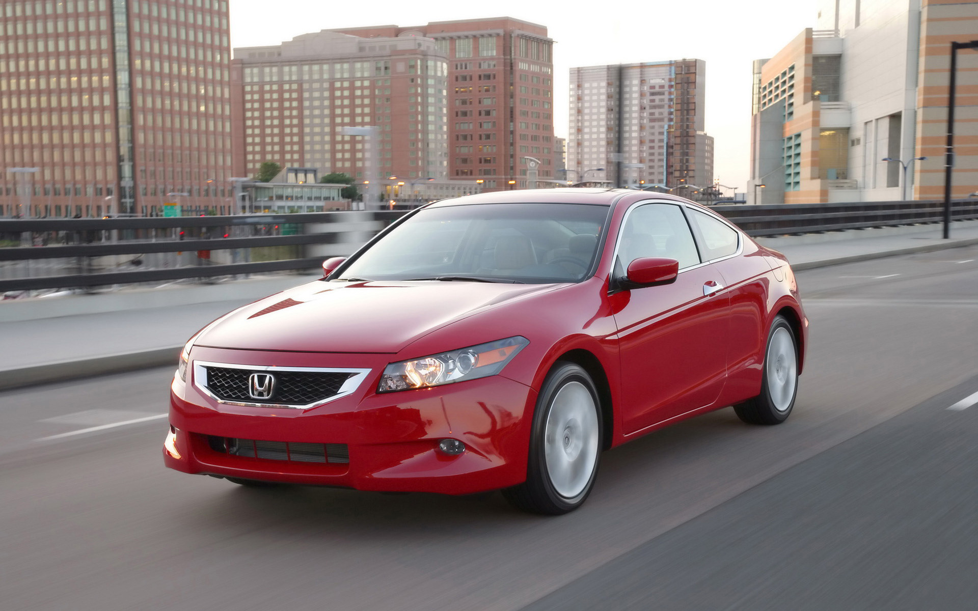Description: A red car driving down a city street next to tall buildings and a bridge with traffic lights on it.