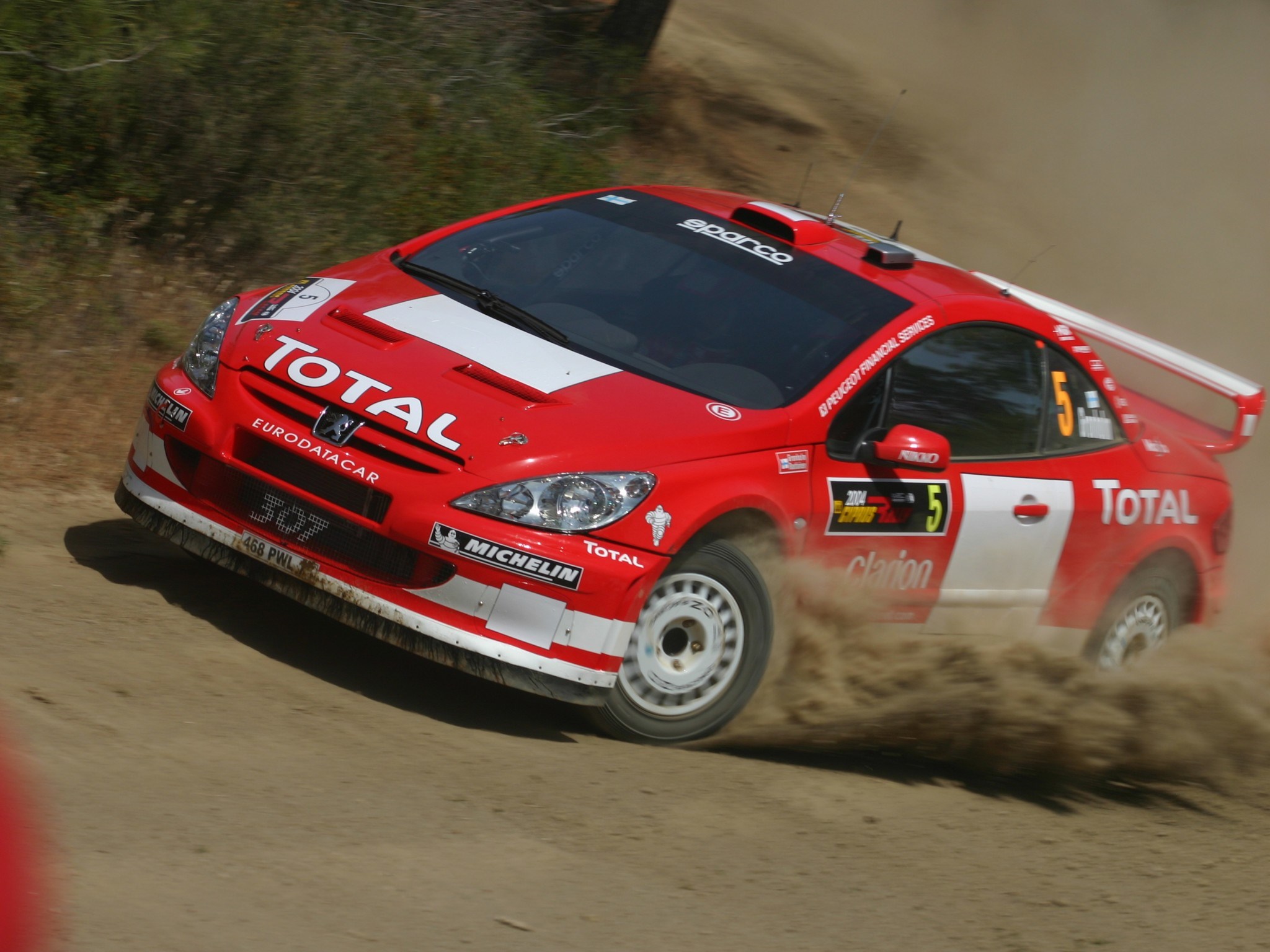 Description: A red car driving down a dirt road next to a forest of trees and bushes on a dirt road.
