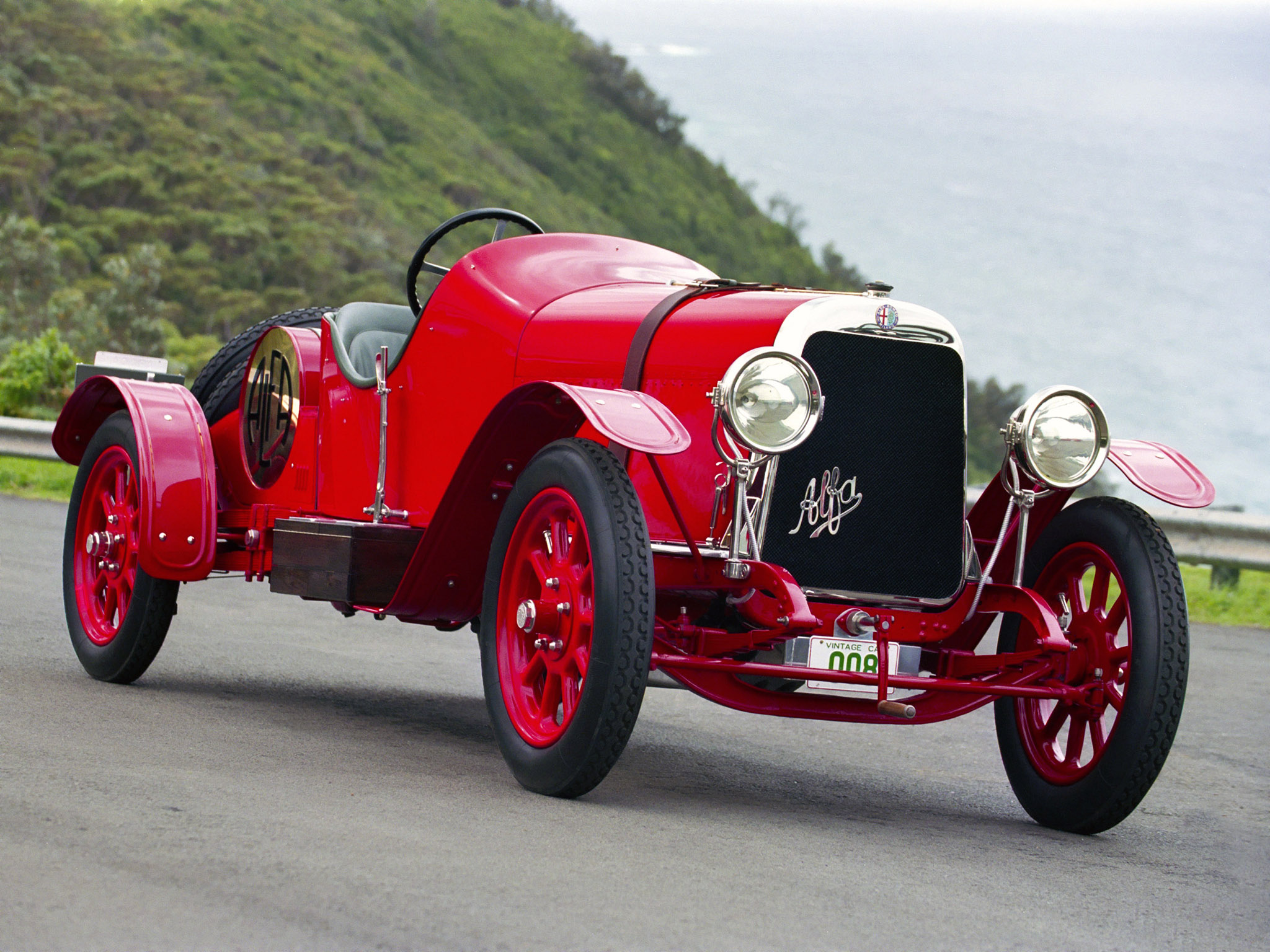 Description: A red car driving down a road next to a cliff side with a body of water in the background.