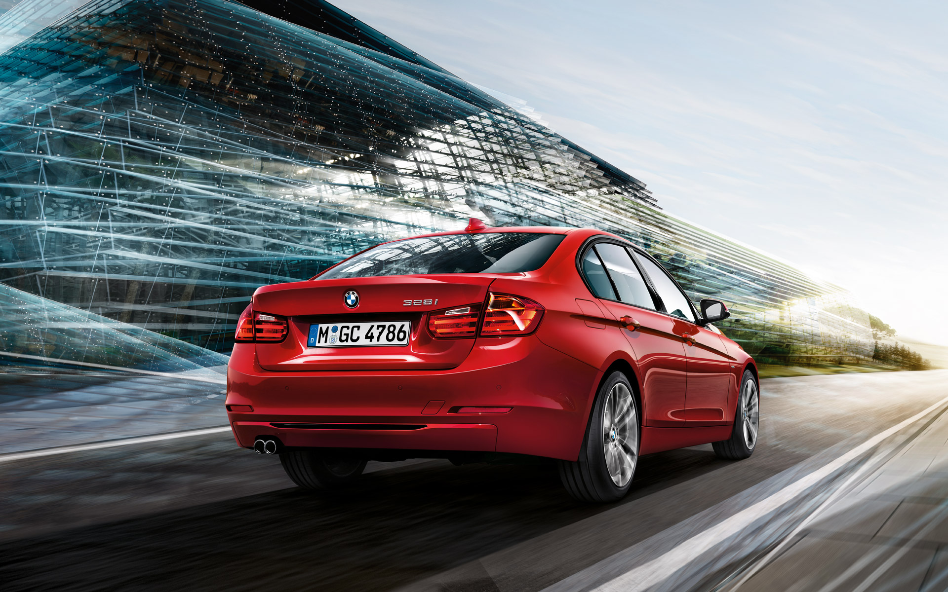 Description: A red car driving down a street next to a tall building with a glass facade on it's side.