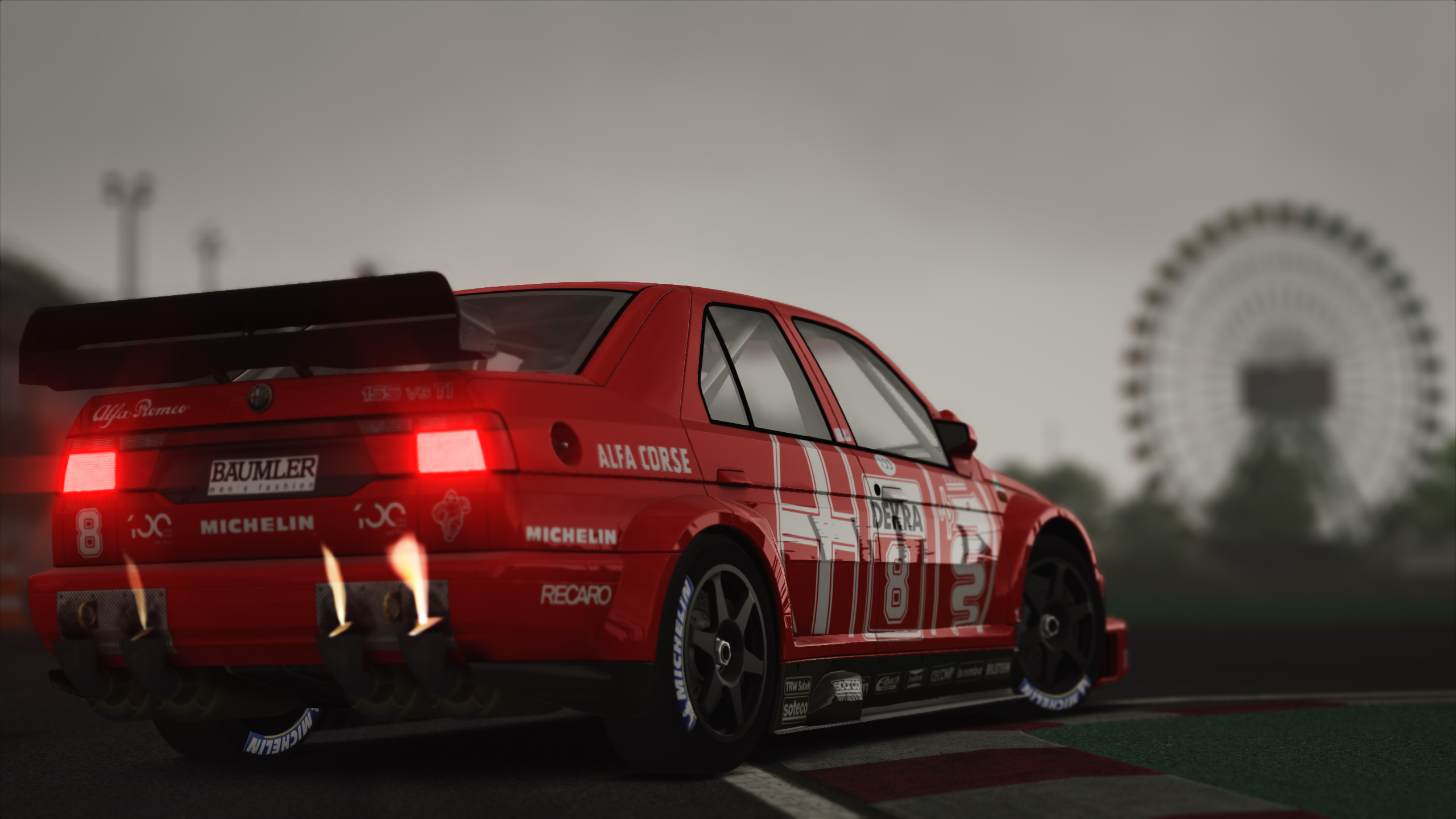 Description: A red car with a ferris wheel in the background and a dark sky in the background.