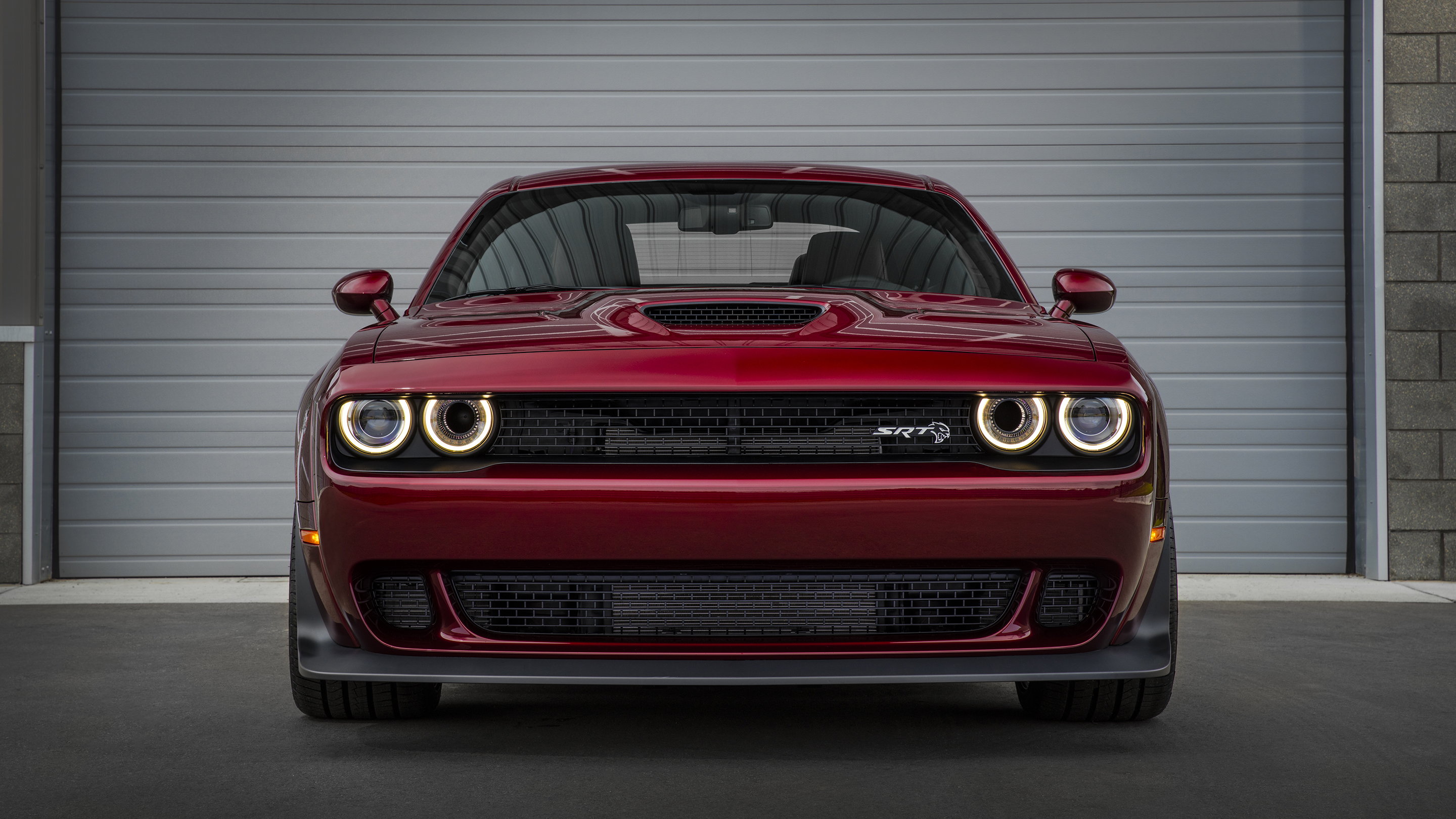Description: A red car is parked in a garage with a garage door open and a light on the front of it.