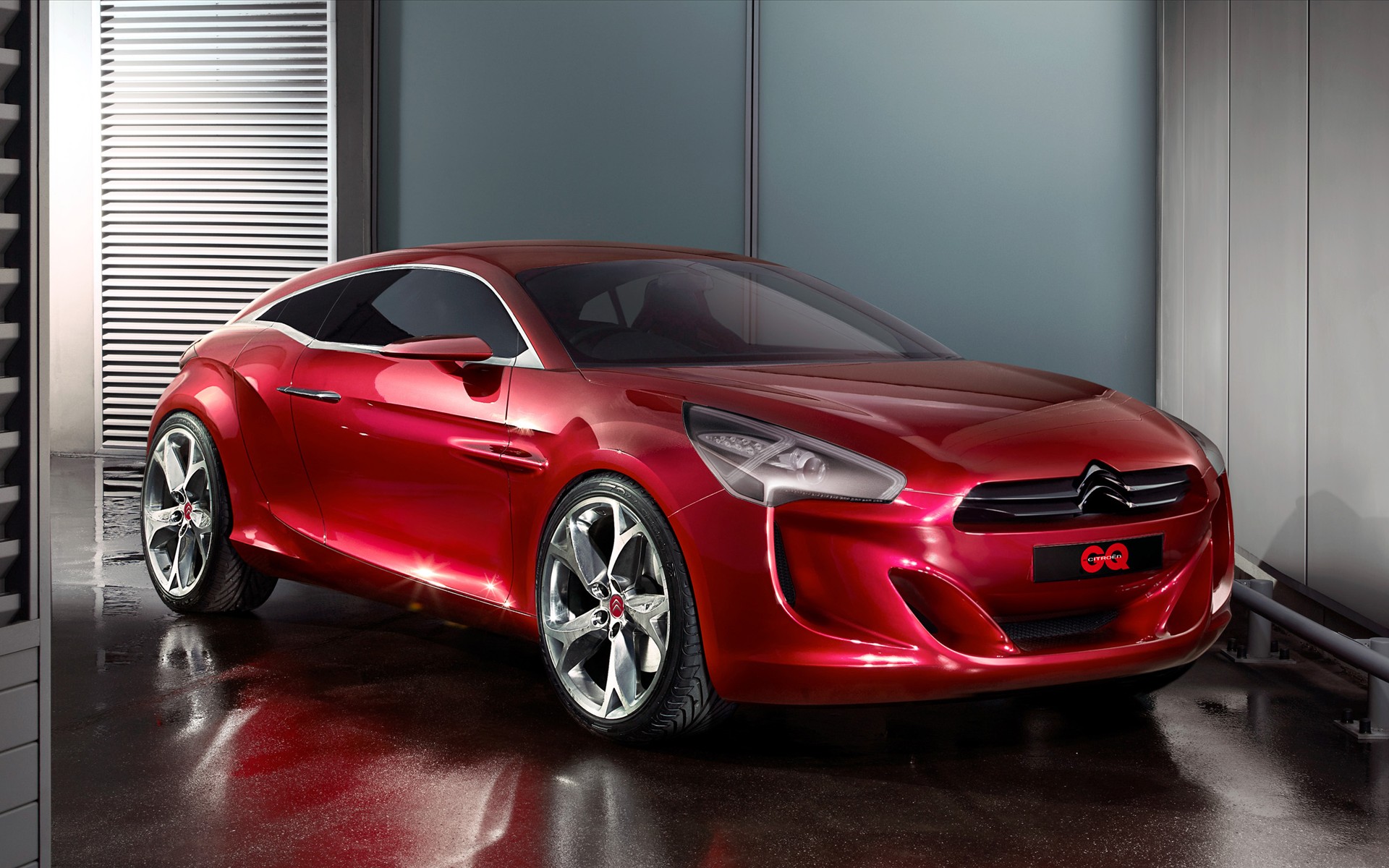 Description: A red car parked in a garage next to a wall with shutters on it's sides and a door open.