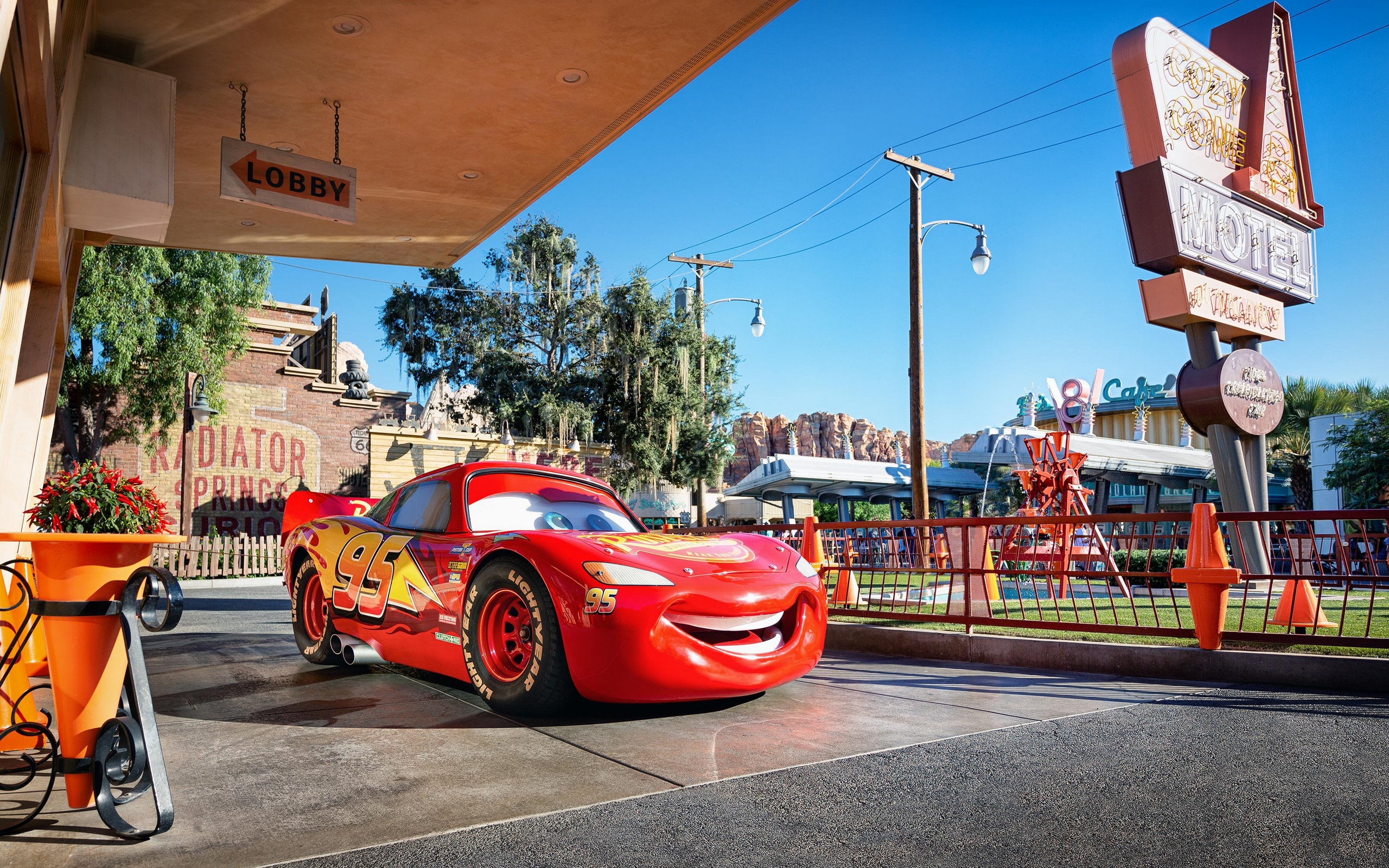 Description: A red car is parked in front of a gas station sign and a sign for a restaurant and a sign for a restaurant.