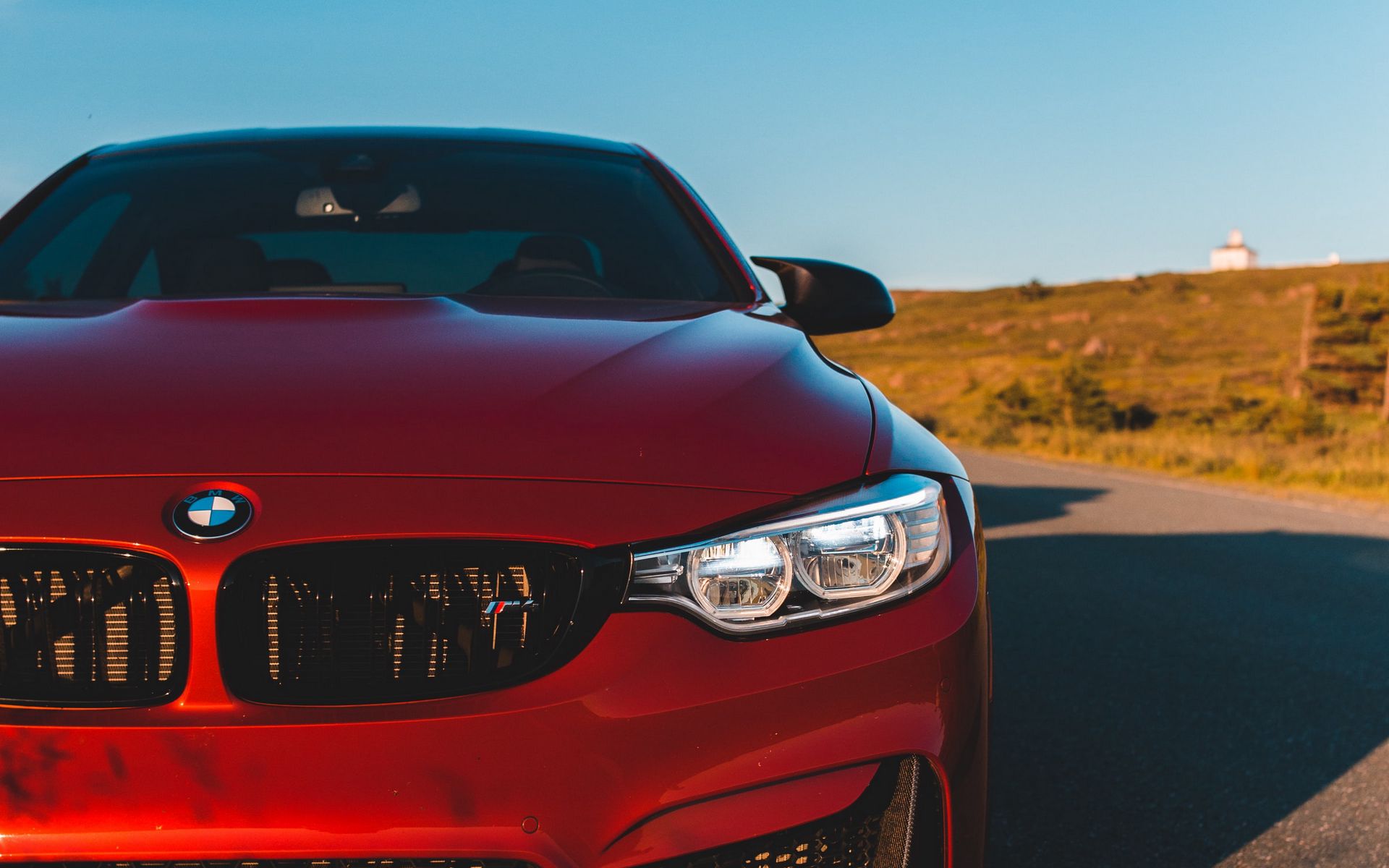 Description: A red car driving down a road next to a hill side with a sky background and a grassy hill.
