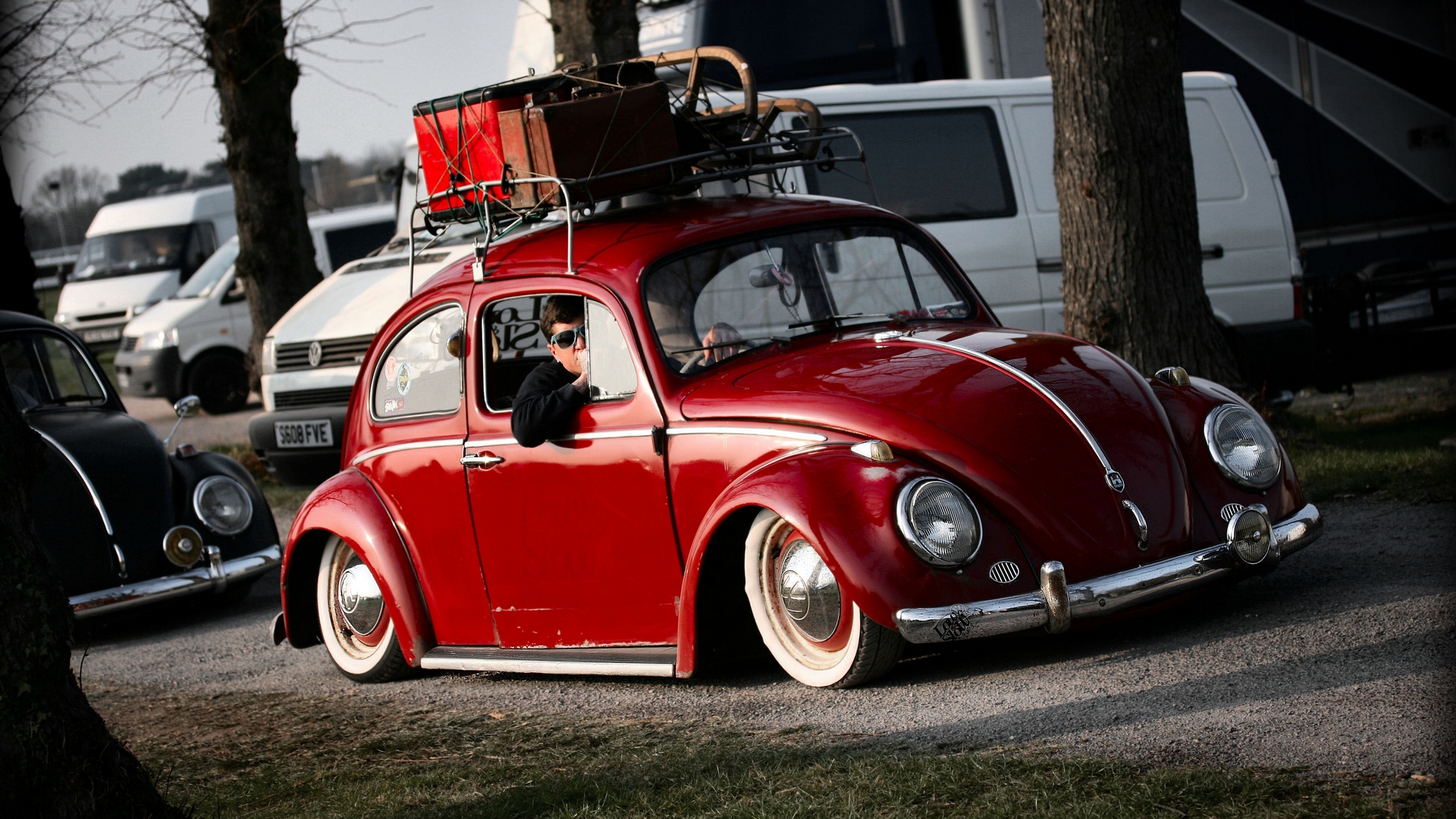 Description: A red car with a luggage rack on top of it's roof rack in a parking lot next to a white van.