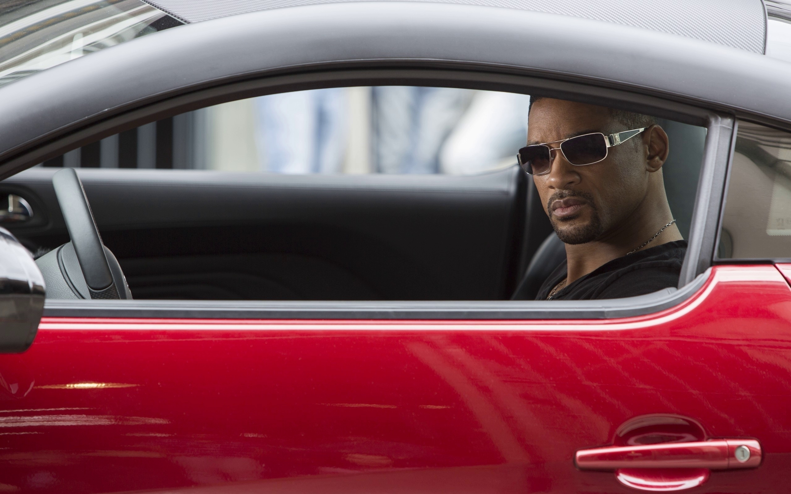 Description: A man in sunglasses sitting in a red car with his head out the window and looking at the camera.