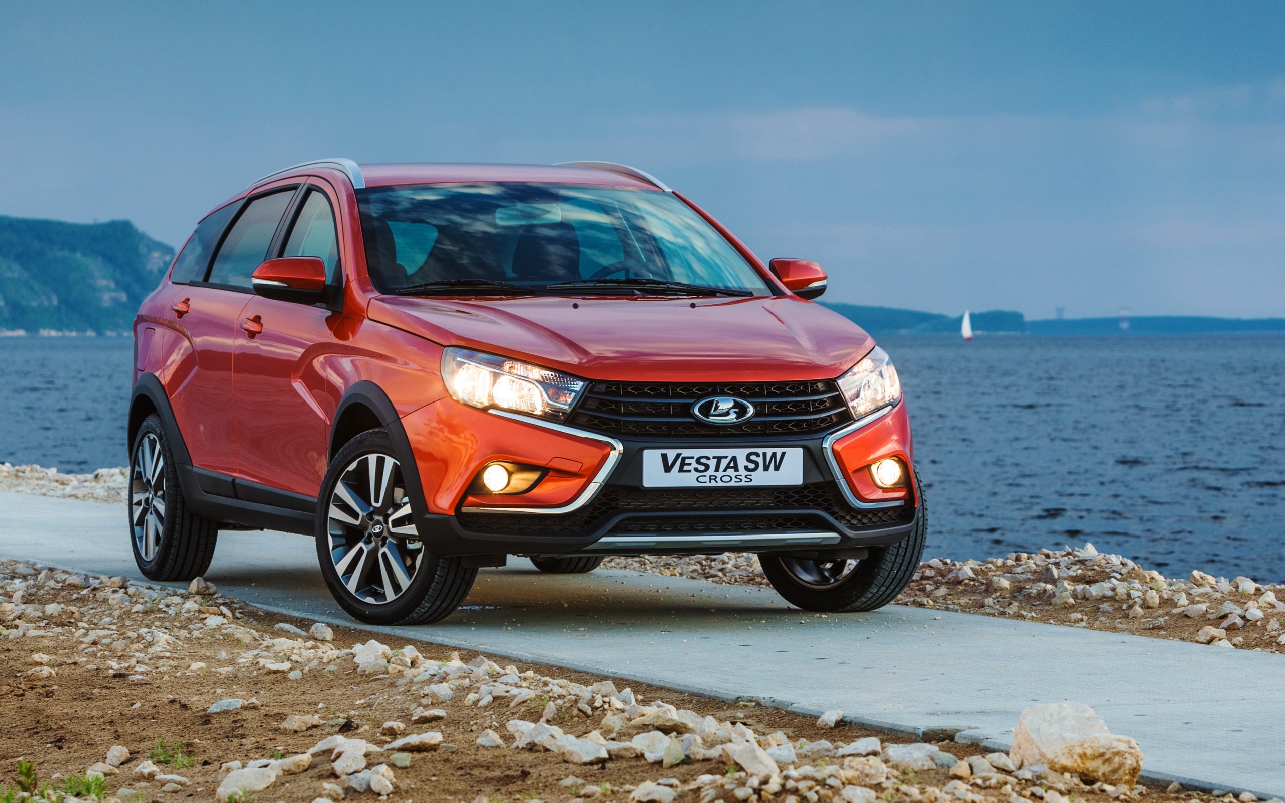 Description: A red car parked on a road next to the ocean and a boat in the water behind it on a sunny day.