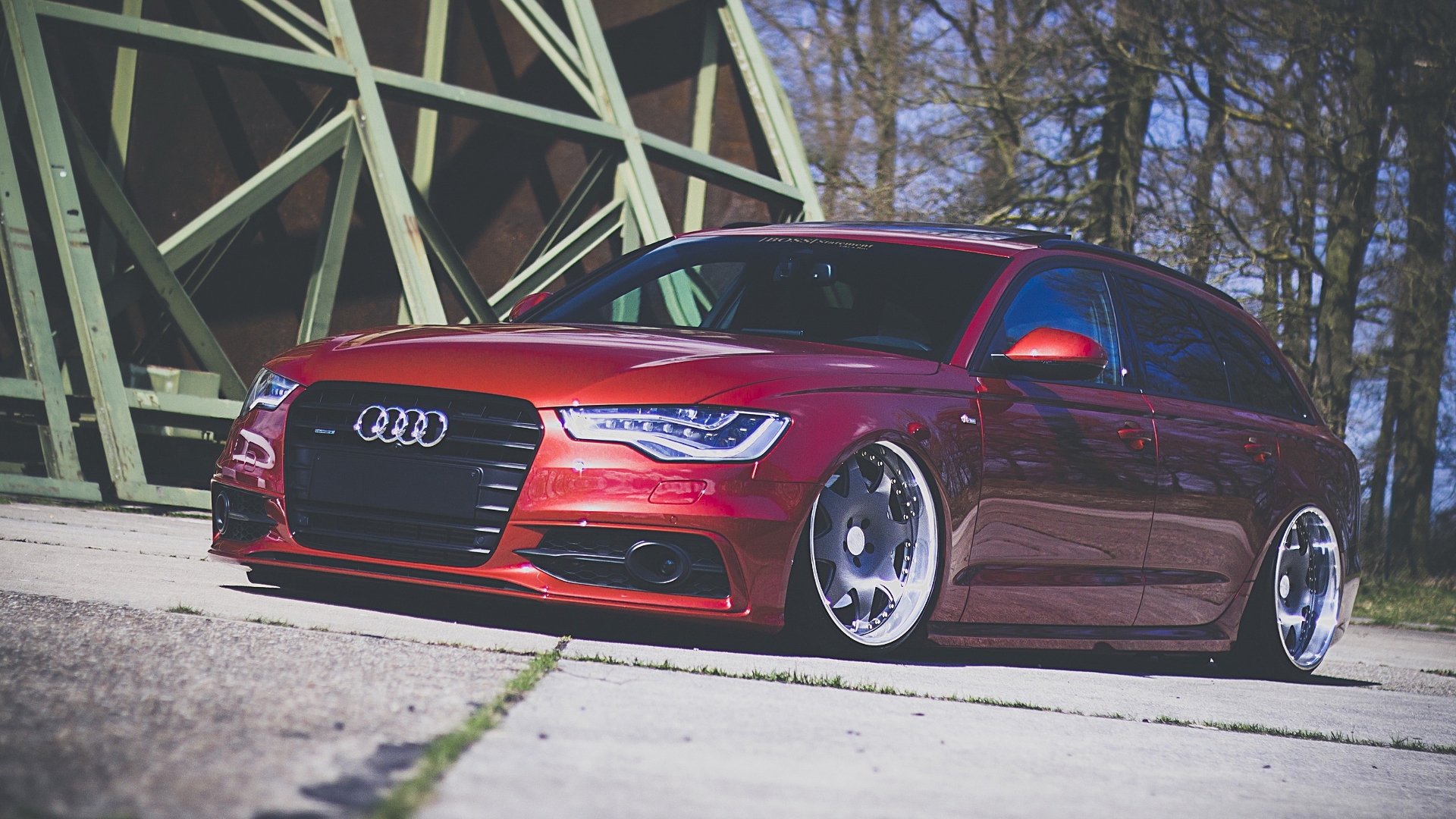 Description: A red car parked on the side of a road next to a bridge and trees in the background with a green metal structure.