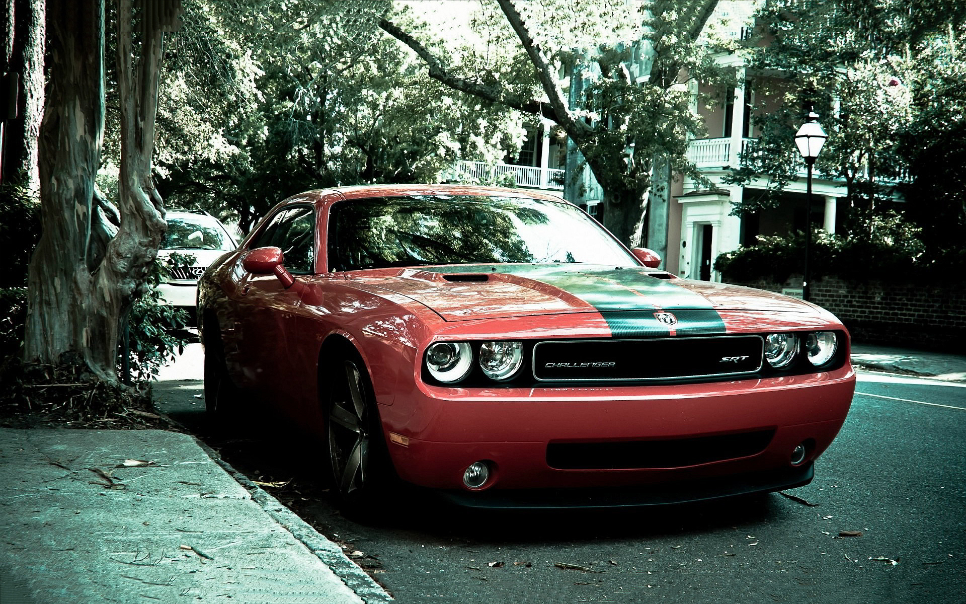 Description: A red car parked on the side of a street next to a tree and a street light with a green stripe on it.