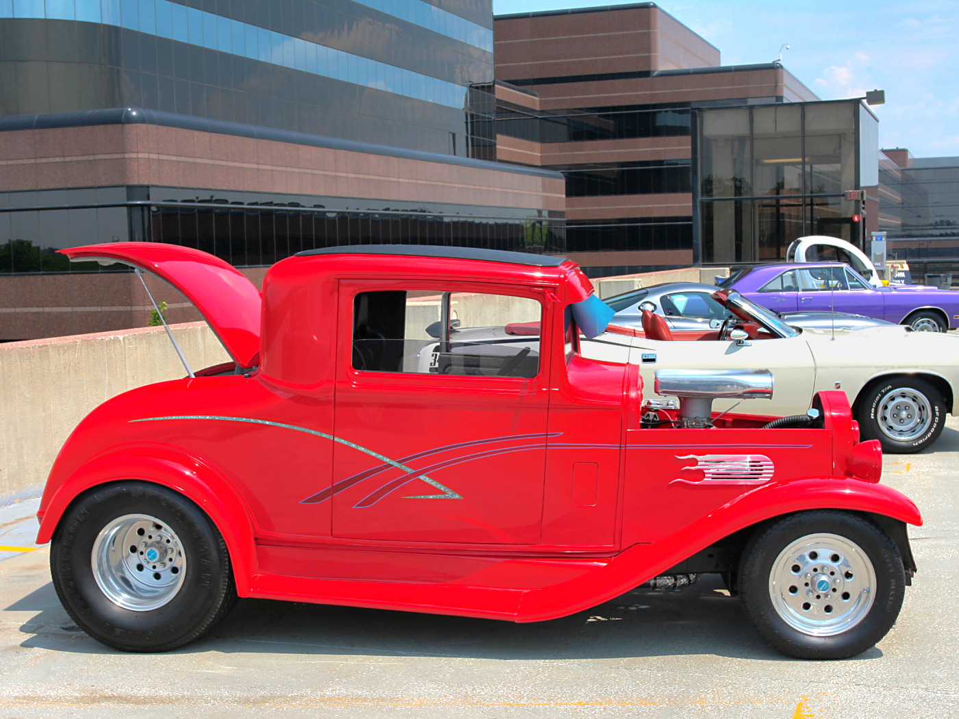 Description: A red car parked in a parking lot next to other cars in a parking lot with a building in the background.